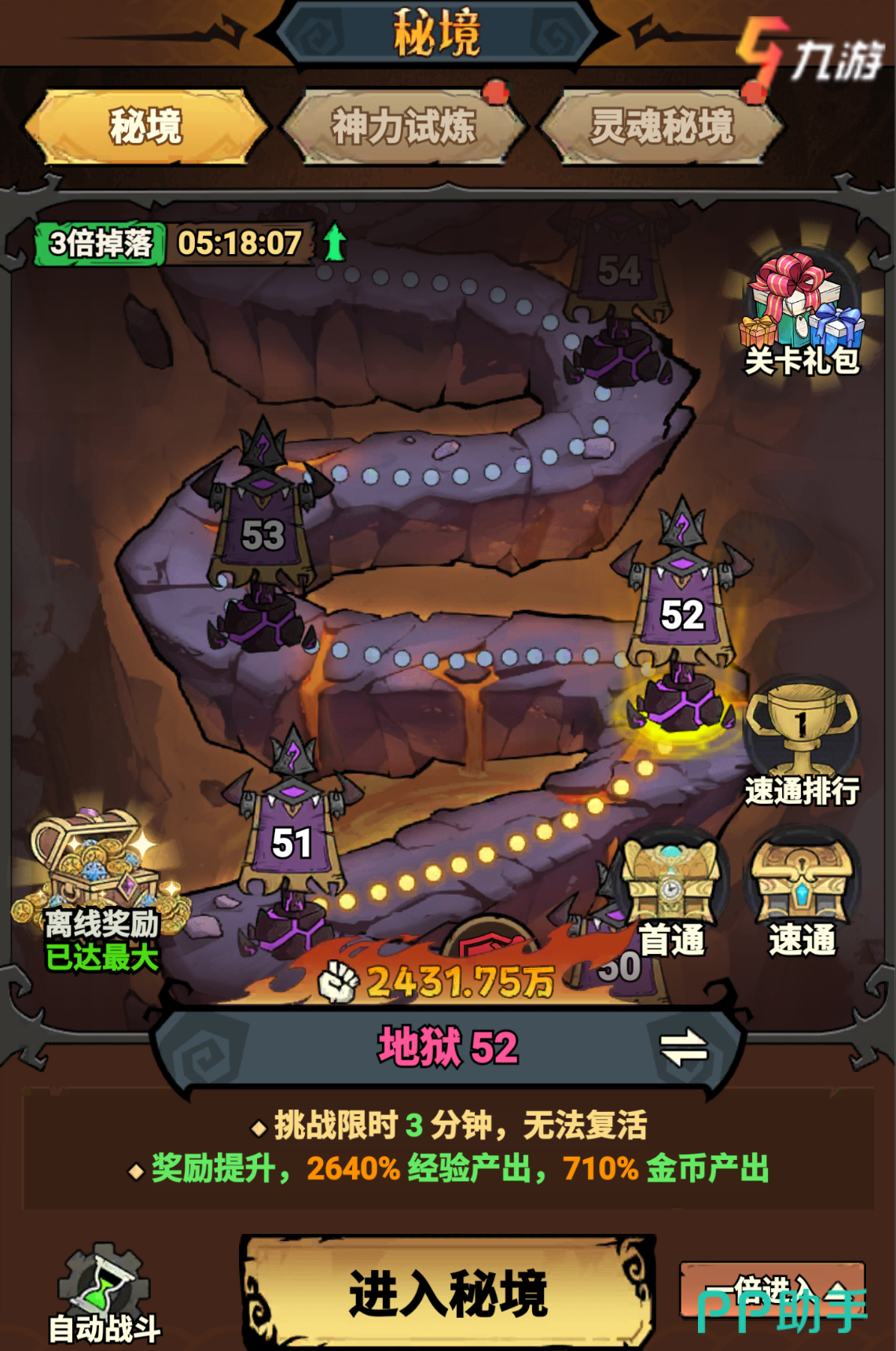 时空秘境副本:包含三大独立玩法模块——猛鬼街道、背包乱斗、数字门。每种玩法均设20关,通关全部共60关可累计领取3000钻石。该系列挑战不依赖角色战力与装备数值,纯靠操作反应,整体难度较低,属于低门槛高回报内容。主线进度达标后即可集中精力完成此部分。
