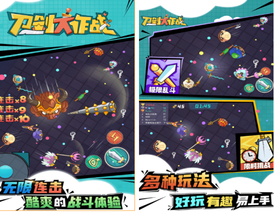 这是一款基于刀剑对抗为核心的IO类多人竞技手游,兼具趣味性与可玩性。游戏提供两种主要模式:极限乱斗和限时挑战。在极限乱斗中,玩家需不断击杀对手获取经验值,用于解锁新角色;而在限时挑战模式下,则需要在规定时间内尽可能消灭更多敌人,比拼操作效率与反应速度。