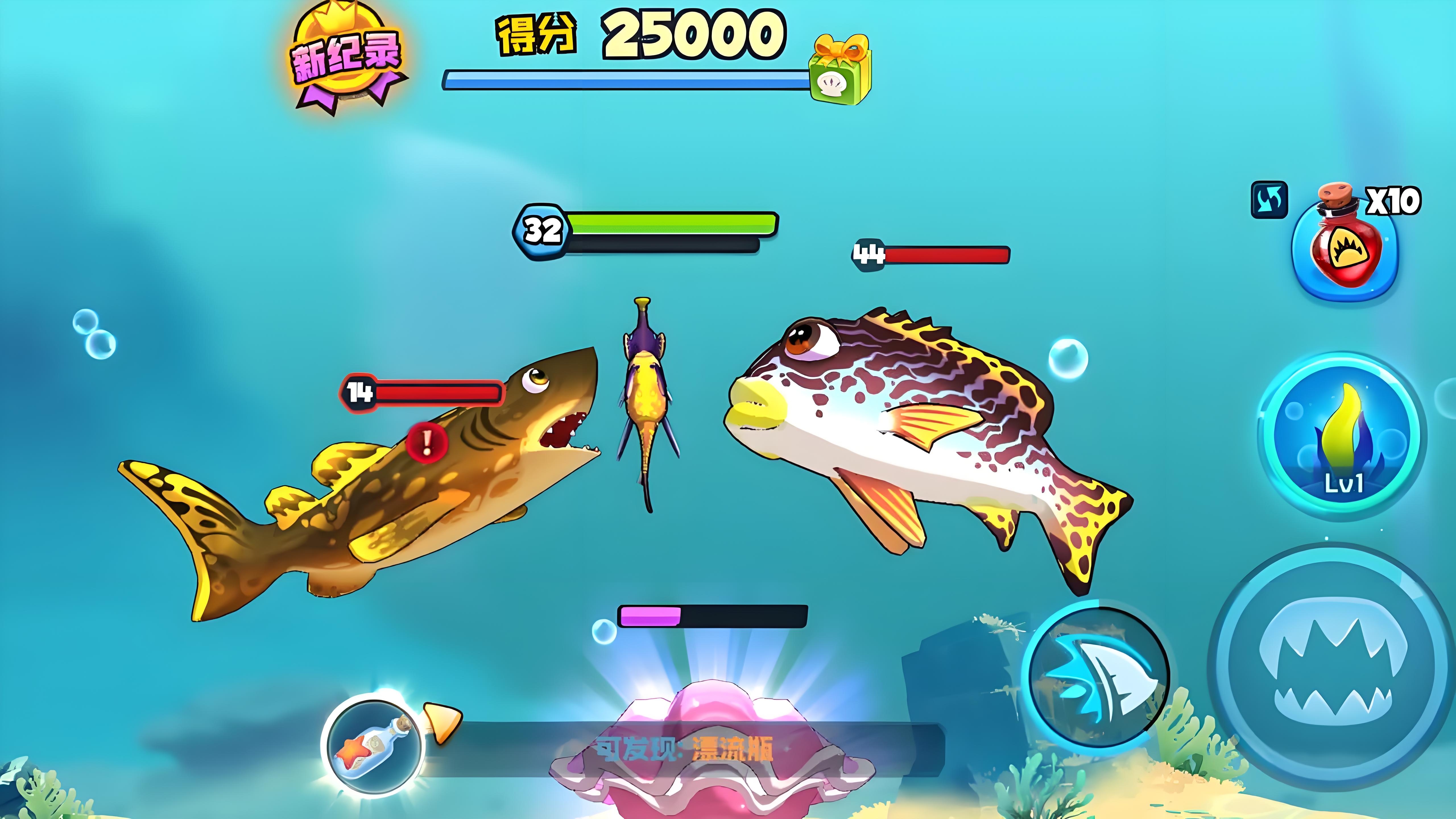 一进入《大鱼吃小鱼-深海大冒险》,玩家便会被带入幽暗深远的海底世界。这里栖息着种类繁多的鱼类,外形千奇百怪。玩家的任务是不断搜寻可以吞噬的对象,借此提升等级和体型。随着实力增强,原本威胁巨大的大型掠食者也不再可怕。每次成功进食不仅能获得分数奖励,还能加快通关进度。当体型足够庞大后,便可主动发起进攻,挑战更强敌人,并完成各类任务赢取额外奖励,开启更多玩法内容。