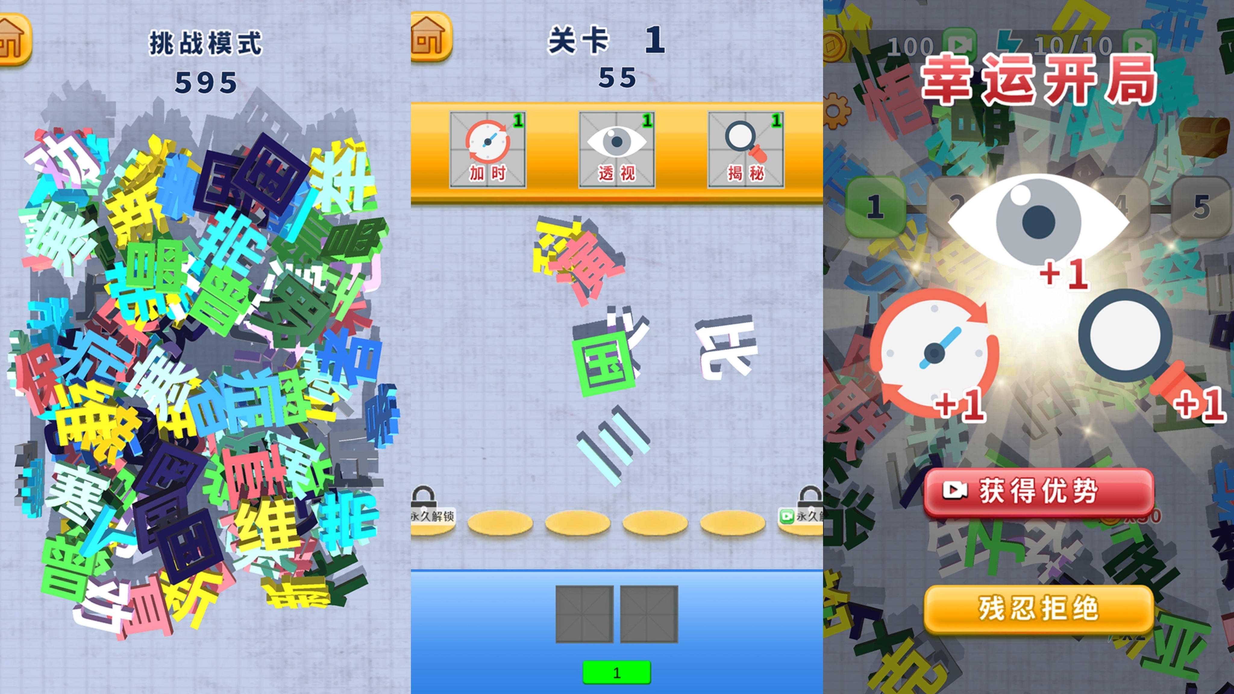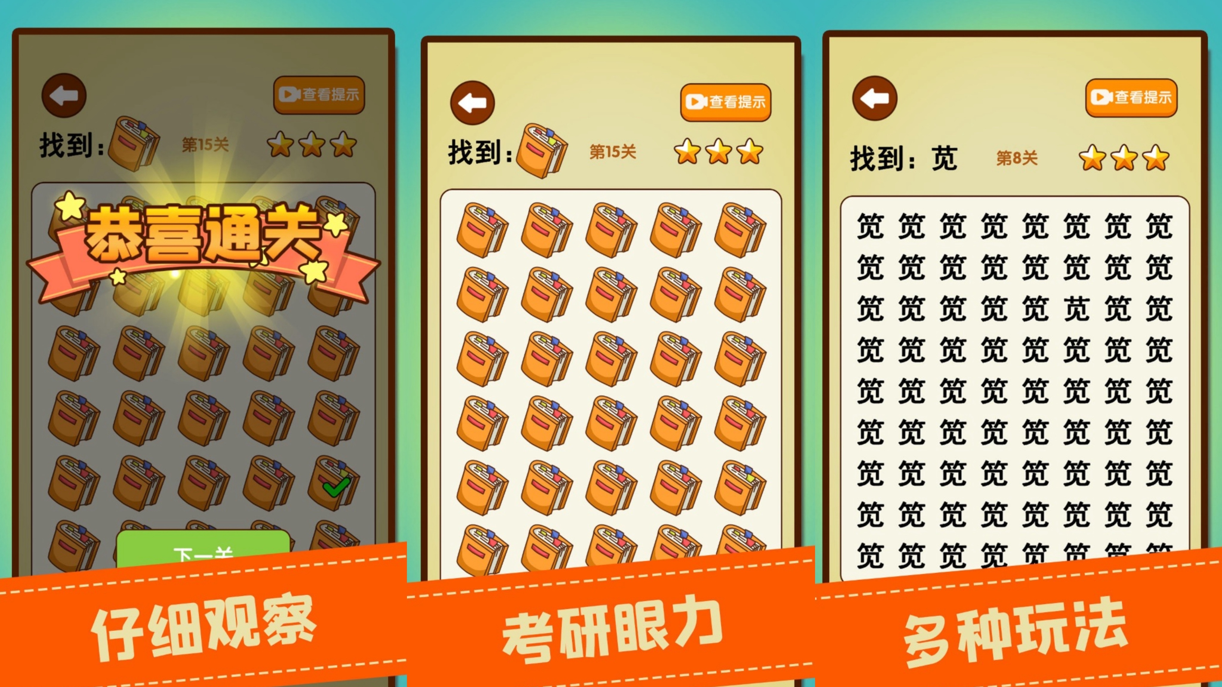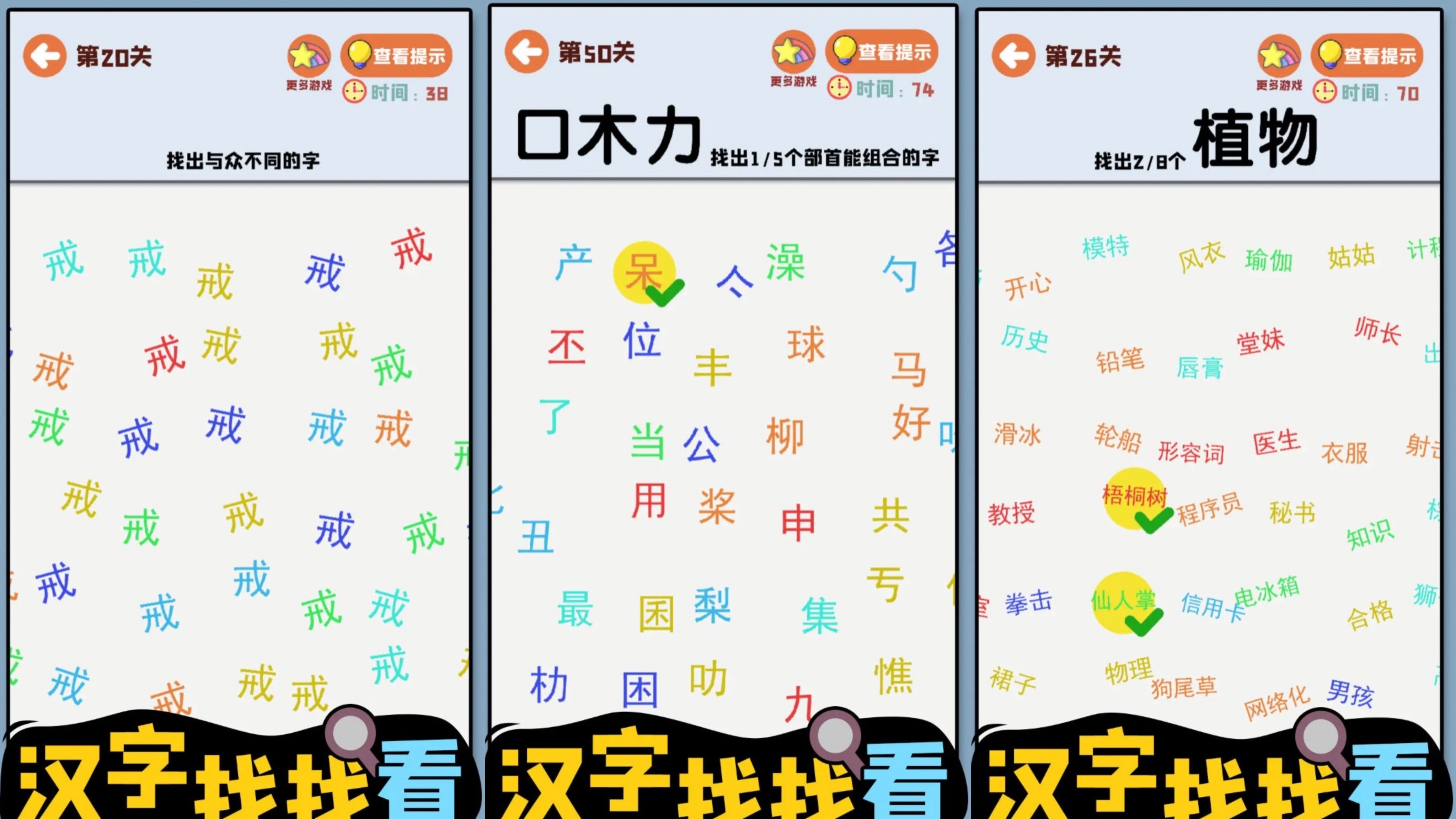 这是一款轻松上手又富有挑战的休闲益智作品。玩家需要从大量混杂的汉字中找出指定的目标字,看似简单实则考验眼力与专注力。随着关卡推进,界面中的文字密度逐步上升,辨识难度也随之提高。为辅助玩家顺利通关,游戏内置了多种实用道具,在关键时刻可帮助缩小搜索范围,让挑战更富策略性。