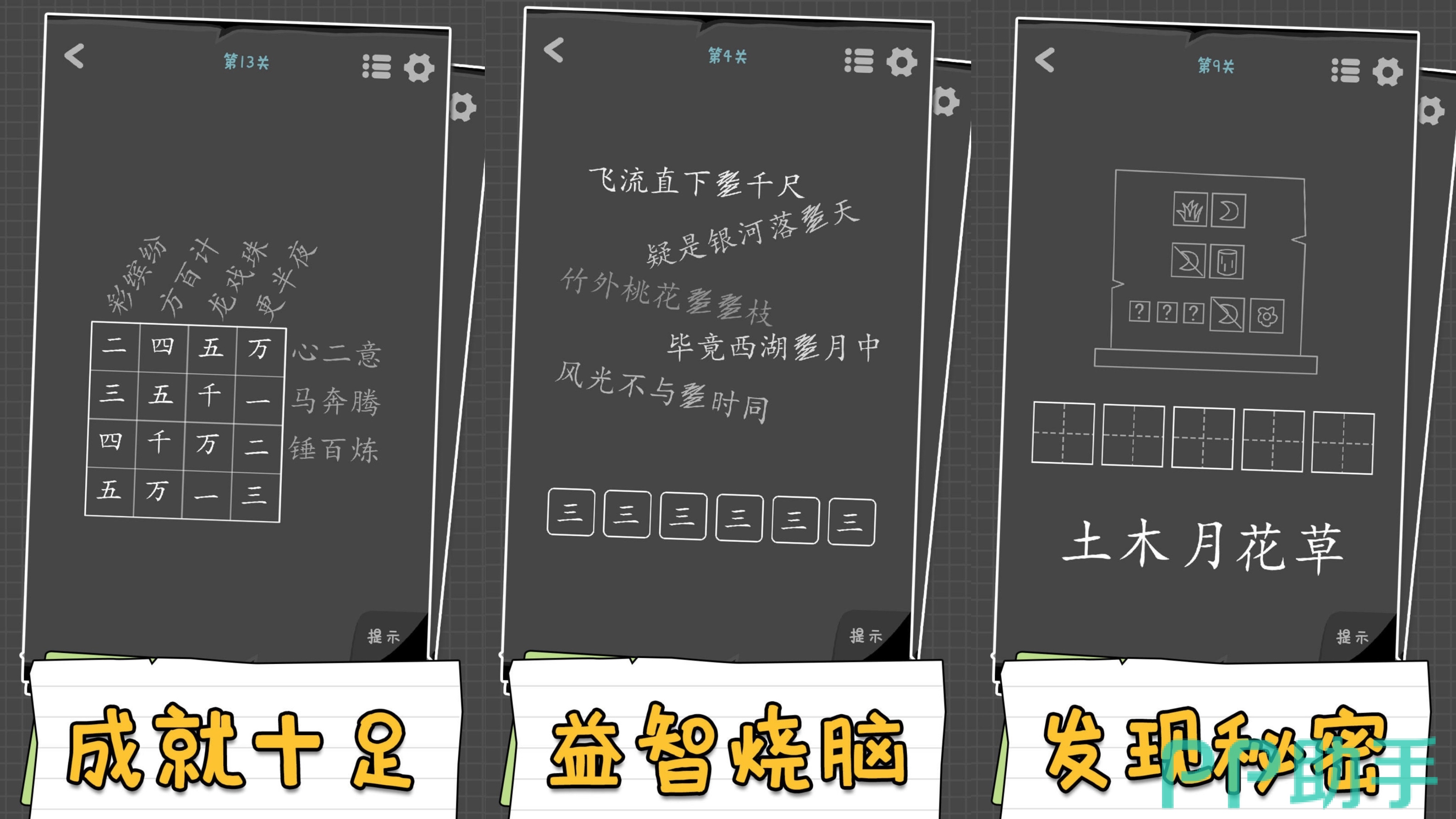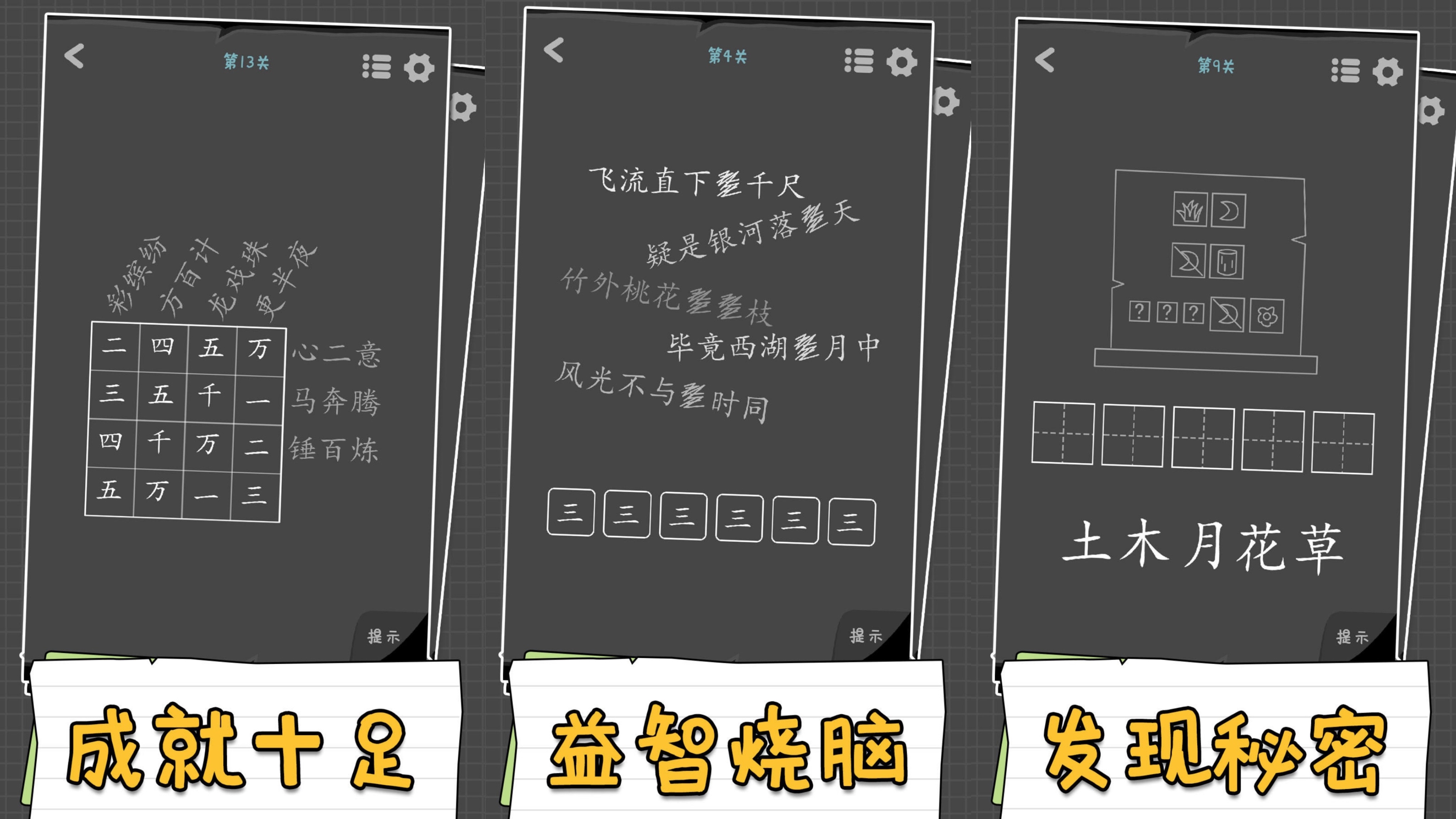 这是一款主打汉字解谜的智力挑战游戏。每个关卡设有独特的任务目标,有的需要通过字形联想破解谜题,有的则依赖语义理解完成推理。题目设计兼具直观性与抽象性,难度分布合理,层层递进。当遇到难以突破的瓶颈时,系统提供的提示功能可以帮助玩家理清思路,继续推进进度,确保流畅的游戏体验。