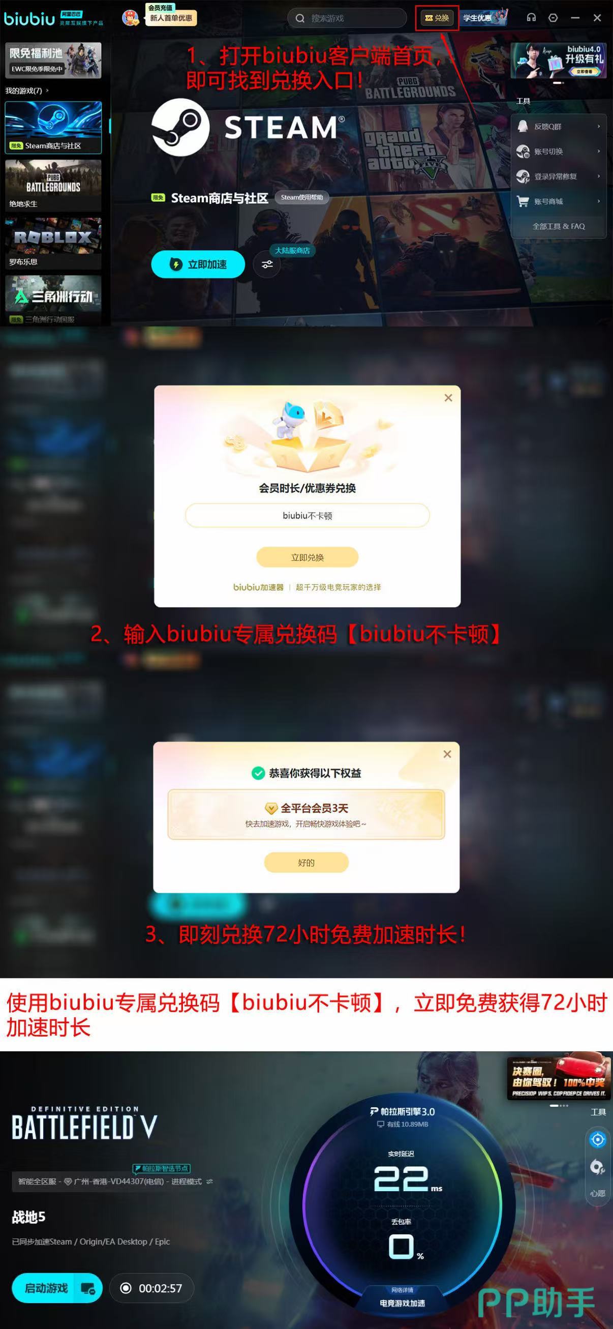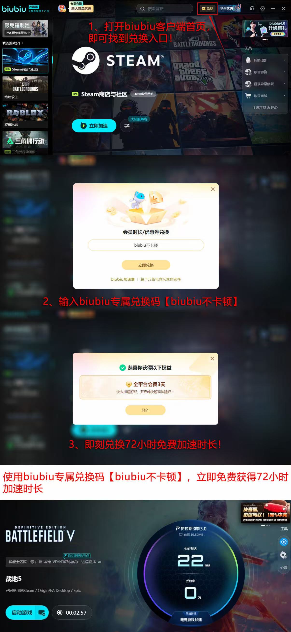 现推出限时体验活动:新注册用户可立即获取24小时全功能免费加速权限,覆盖包括《战地5》在内的全部游戏资源。此外,输入兑换码【biubiu不卡顿】即可额外领取3天高级加速服务,该权益面向所有账号开放,限每人限领一次。