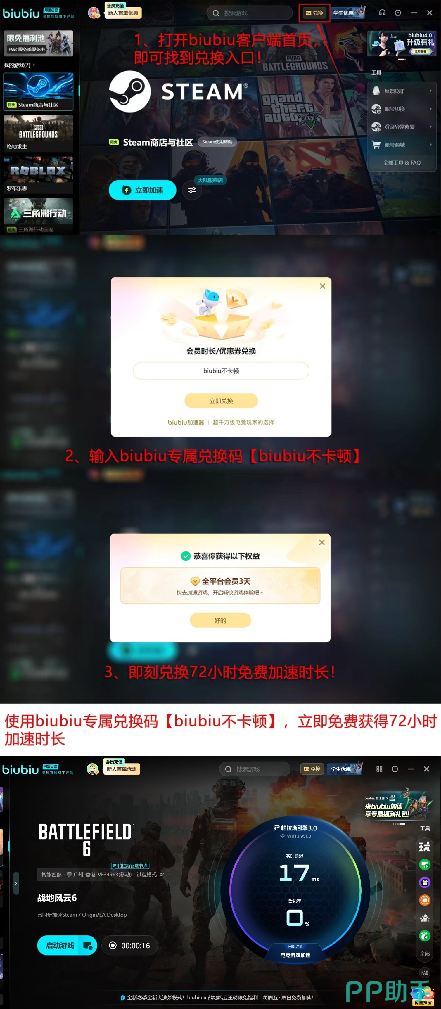 如果你此前未曾使用过网络加速工具,现在正是尝试的好时机。新用户注册biubiu账号即可免费获得24小时加速时长,无需任何费用即可亲身体验其对《战地6》网络表现的实际提升效果。同时,现有用户也可享受官方推出的限时福利:在客户端内输入兑换码【biubiu不卡顿】,即可领取72小时加速服务,此优惠同样适用于新注册用户,帮助更多玩家实现稳定畅玩。