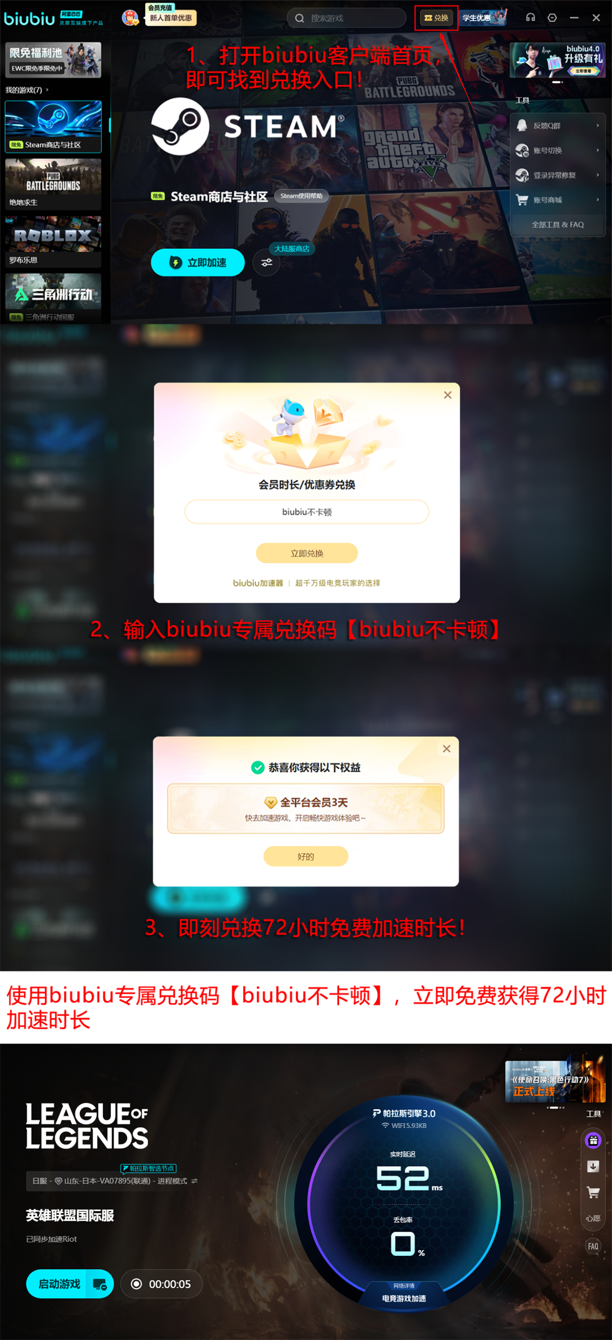 在用户体验方面,biubiu同样表现出色。新用户注册即可享受24小时免费加速服务,轻松体验完整功能。同时,输入专属兑换码【biubiu不卡顿】还可额外领取72小时会员时长,每位账号限用一次,总计最高可达96小时免费使用时间。对于初次尝试的玩家来说,这样的福利设置极大降低了试用门槛。除此之外,平台还整合了实用的游戏攻略查询系统以及活跃的玩家交流社区,助力玩家快速掌握版本动态与战术技巧。