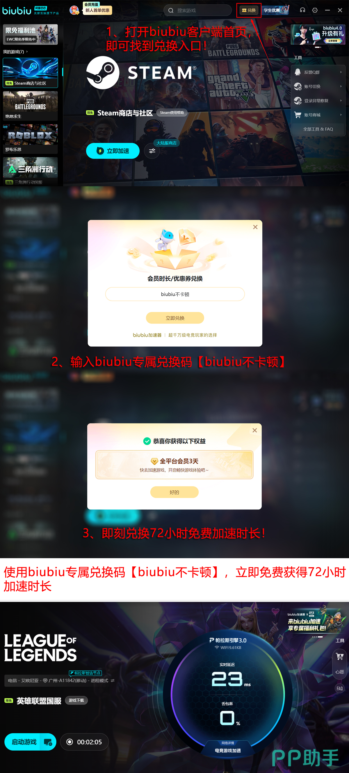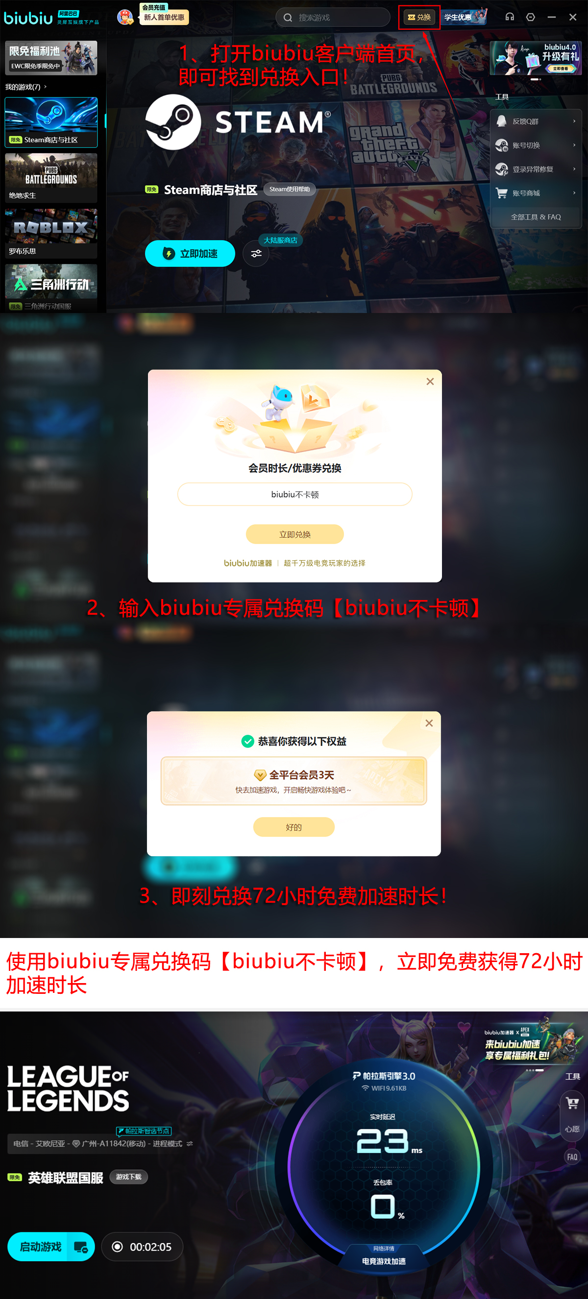想要先体验效果?新用户注册即可领取24小时免费加速时长,亲身感受流畅对战的乐趣。无论新老玩家,输入兑换码【biubiu不卡顿】都能额外获得三天免费使用权限,延长试用周期,在短时间内冲击更高段位,积累更多胜场积分!