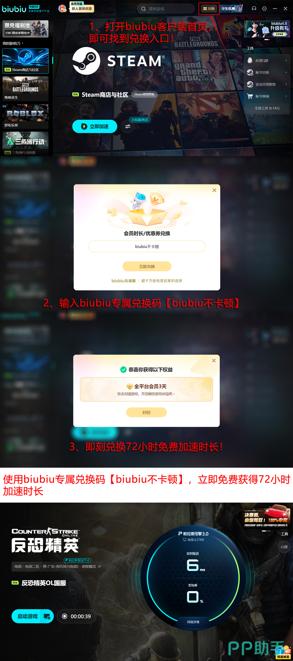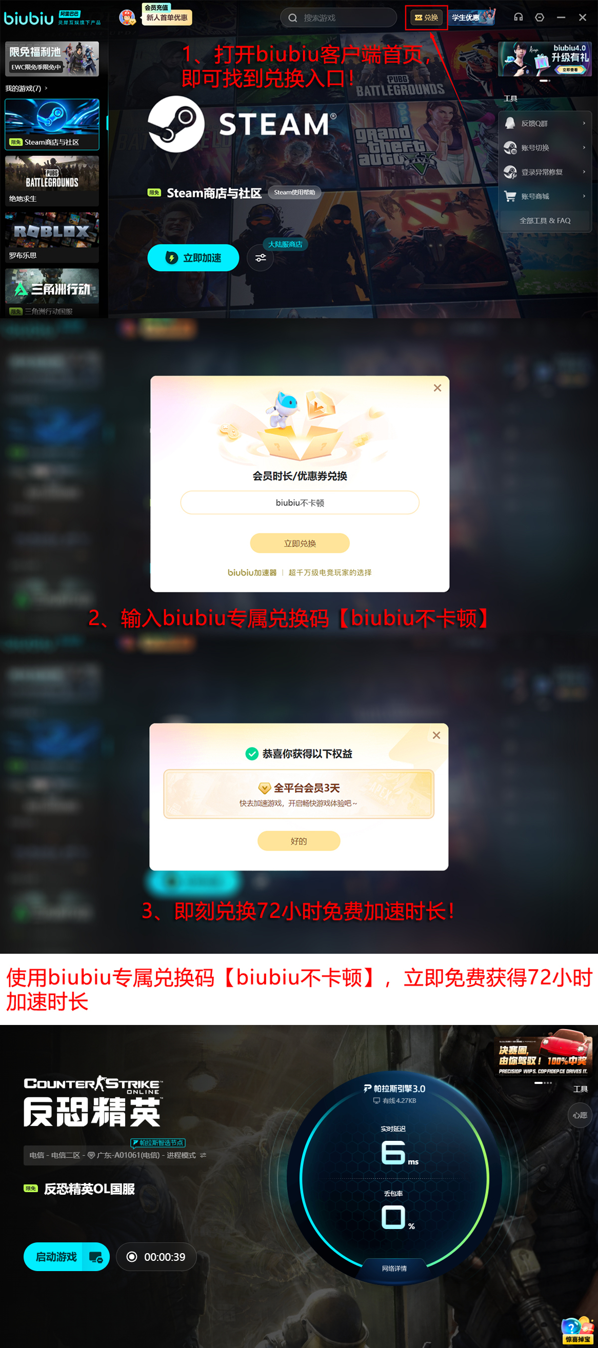 除了技术升级外,biubiu加速器在用户体验方面也有大幅提升。新注册用户可享受长达一天的免费加速服务,无需立即付费即可先行体验全部功能。相比市面上多数需先充值才能使用的同类产品,这种“先试后买”的模式更加友好。同时,现有限时活动正在进行中:输入兑换码【biubiu不卡顿】,无论新老账户均可额外领取3天免费加速时长,帮助玩家无忧畅玩csol及其他热门网游。