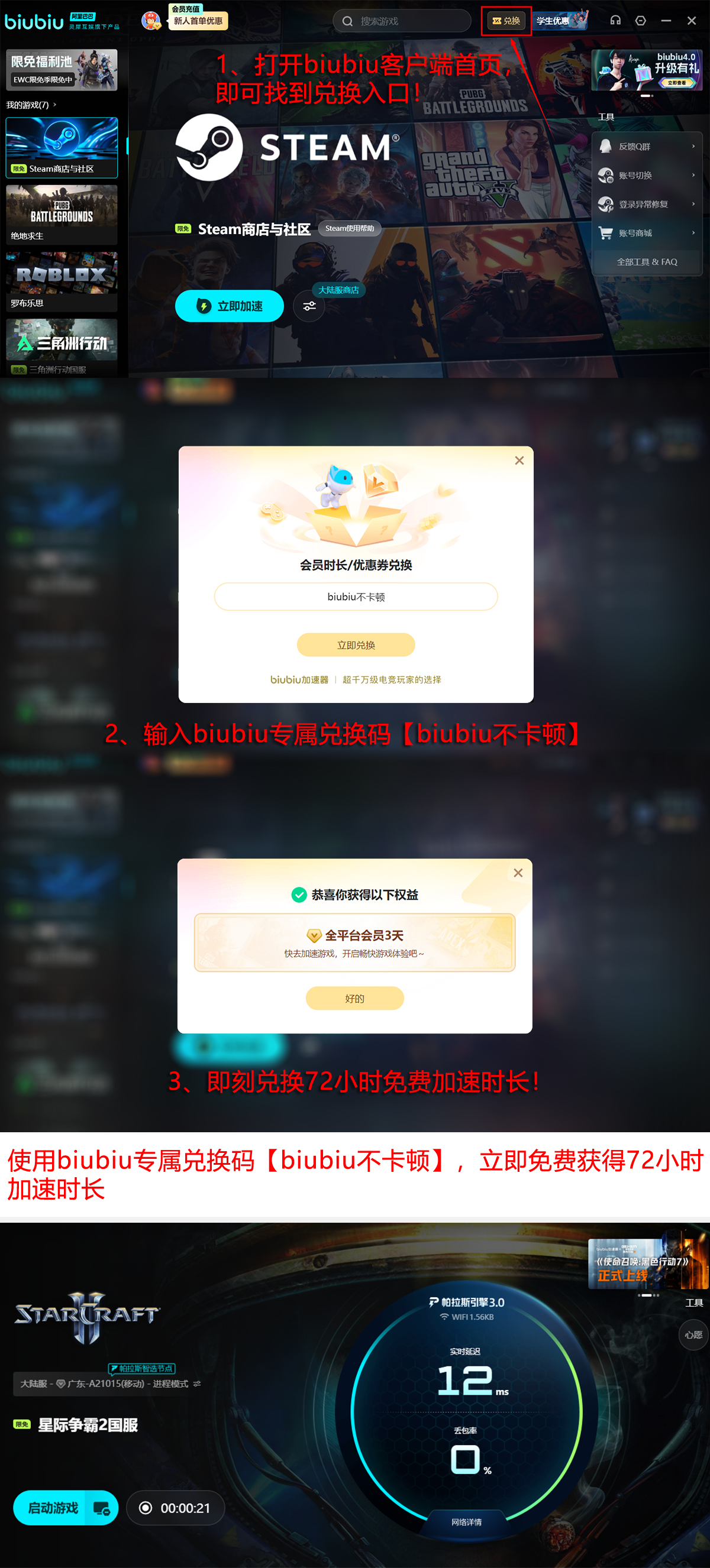 对于初次尝试的用户,注册即可领取24小时免费加速福利,降低试用门槛。体验结束后若仍感满意,无论新老玩家,输入兑换码【biubiu不卡顿】均可额外获得三天免费服务。精打细算之下,新用户最多可享受长达96小时的连续加速时间,足够与朋友连开多局,尽情驰骋于浩瀚星海之中。