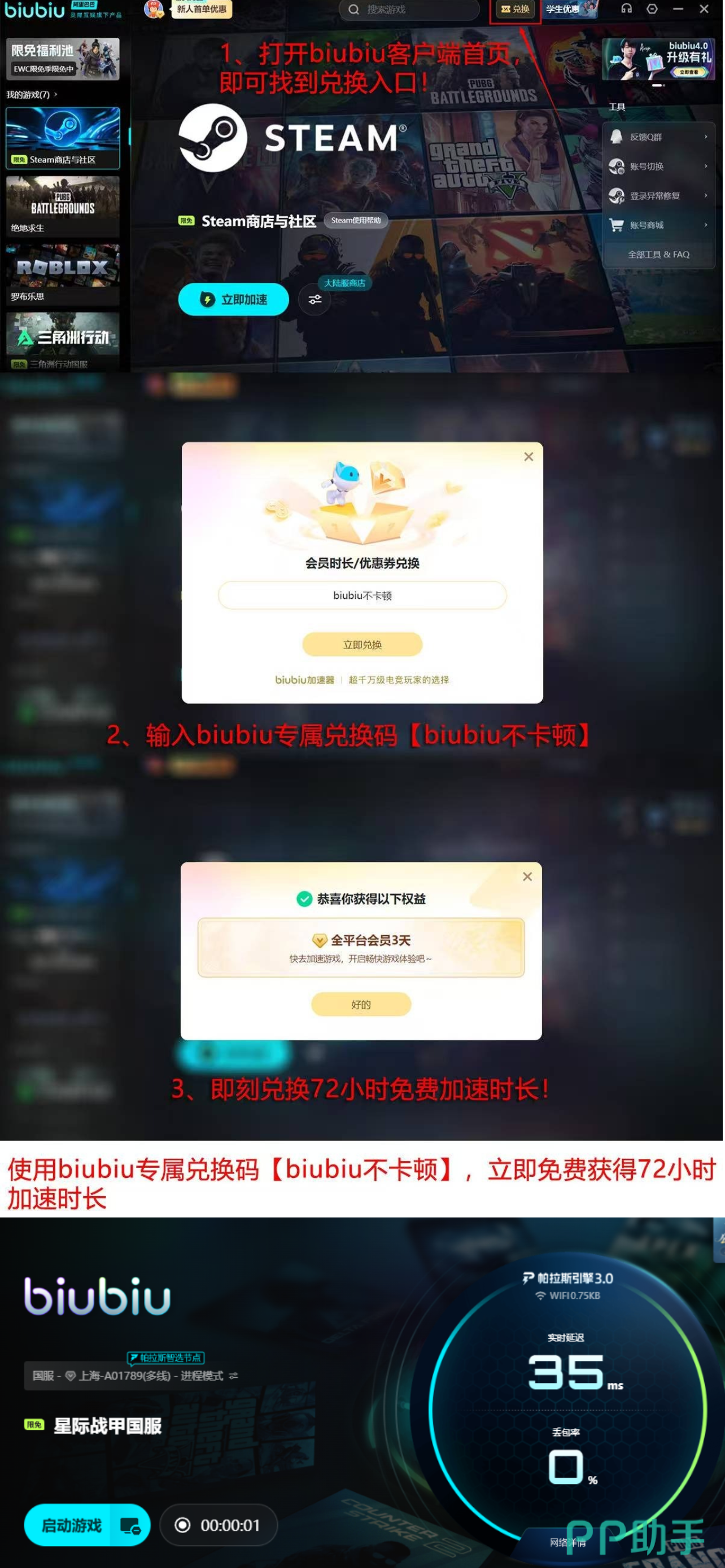 对于新用户而言,现在注册即可享受多重免费体验福利。首次登录后可立即获得一天的免费加速权限,同时平台还额外赠送三天试用时长,以便更多玩家充分体验加速效果。只需前往指定兑换区域输入【biubiu不卡顿】即可领取相关时长,无需任何消费即可感受高效稳定的连接体验。