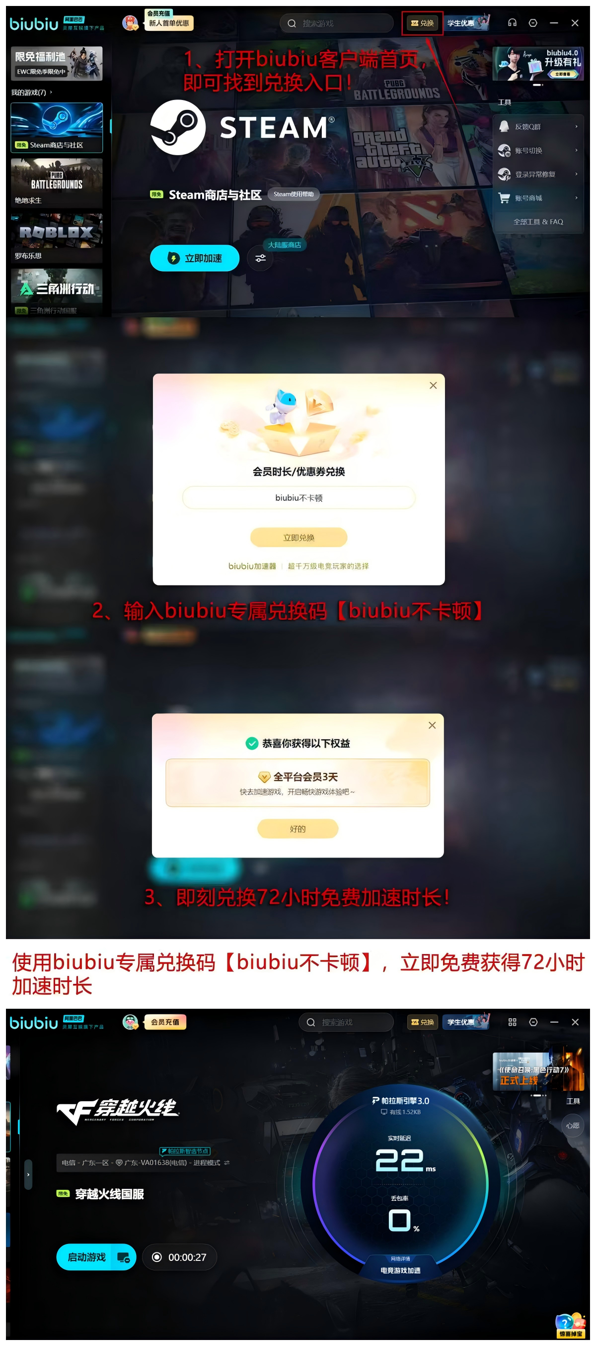 目前根据图示步骤输入【biubiu不卡顿】口令,即可领取72小时免费加速时长,叠加新用户专享的24小时试用权益,总共可获得96小时的加速服务。对于尚未熟悉此类工具的玩家,可先通过免费时段体验实际效果,再决定是否持续使用。该加速器不仅拥有现代化的视觉界面,还支持呼吸灯特效显示加速状态,兼具美观性与实用性,是当前较为可靠的选择之一。