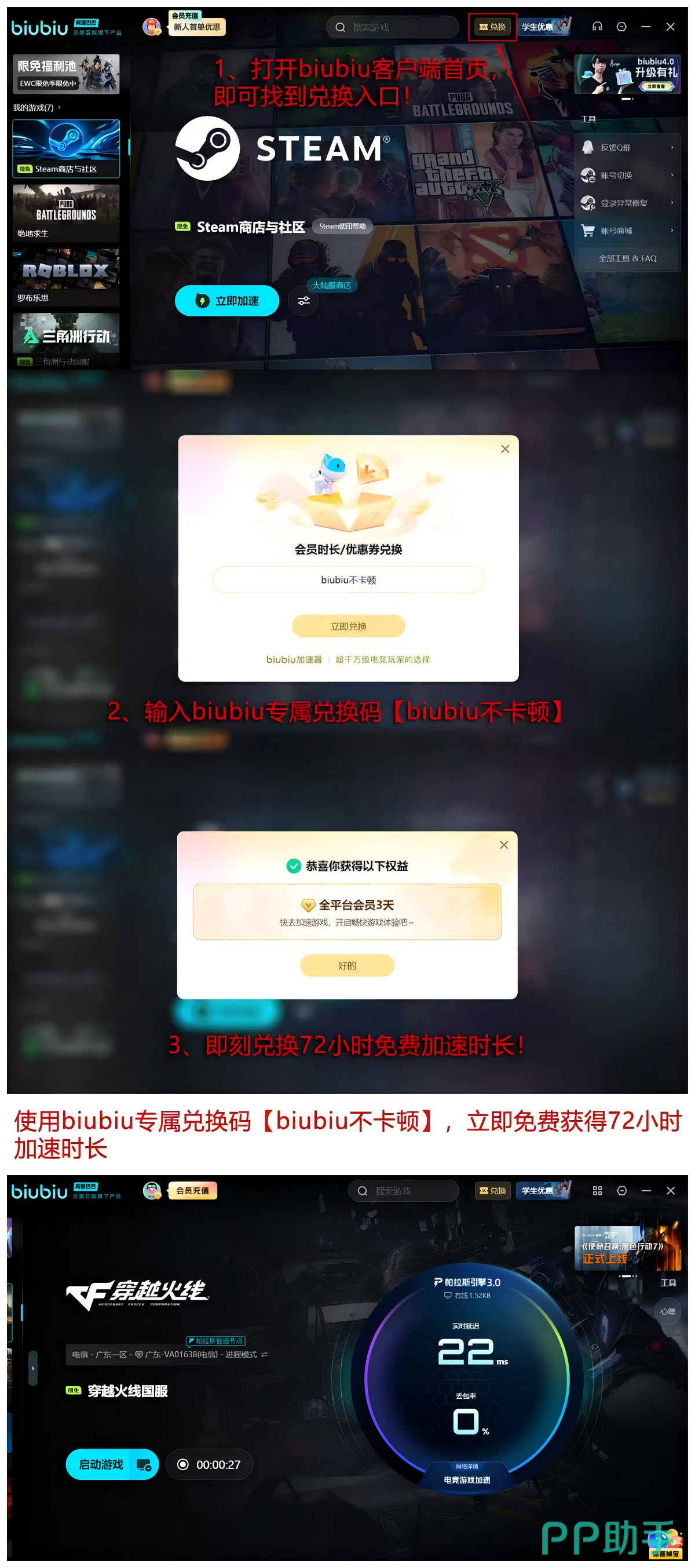 由PUBG世界冠军左梓轩推荐的biubiu加速器,在搭载全新帕拉斯引擎3.0后,网络加速能力大幅提升,能够有效防止穿越火线游戏中断线、红网等现象,确保在网络稳定的基础上发挥设备应有的帧率表现,助力玩家在高强度对抗中保持精准输出。