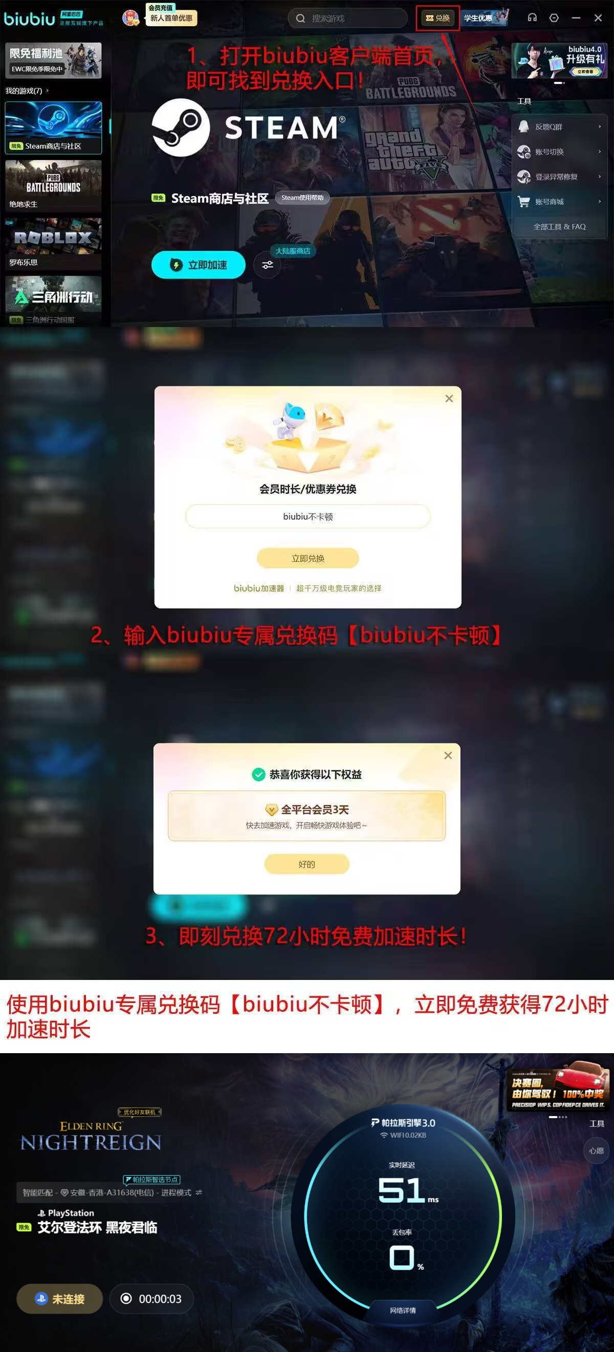 为帮助更多玩家快速体验其性能优势,官方推出多项新人激励措施:新用户首次登录即可获赠24小时免费加速时长;所有注册用户均可凭口令【biubiu不卡顿】兑换3天会员限免权限,成功提交后即时生效。需注意,上述福利每人仅限领取一次,不可重复使用。