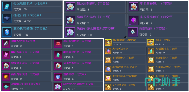 在街机恐龙中,存在多种可用于交易的掉落物品,而它们的价值与稀有度直接挂钩。目前游戏中流通的可交易物品共分为四个等级:普通品质、稀有品质、神话品质和史诗品质。每种品质对应不同的收益水平。普通品质如强化纤维、高级珍宝精华等,适合日常积累,提供稳定的保底收入;稀有品质如加隆背脊碎片、终极龙息琥珀,则能带来中等回报;神话品质属于高价值目标,是搬砖玩家的主要追求对象;而史诗品质如史诗珍宝精华、不朽龙骸碎片,一旦获得,往往意味着单日搬砖任务轻松达成,堪称“财富密码”。