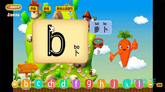 游戏以“海洋钓鱼”为叙事主线,将全部23个声母与24个韵母转化为形态各异的小鱼角色,每条鱼对应标准发音与书写形态。内置专业播音员级童声音频,确保音准规范;配合“拼音+组词+插图”三维呈现方式,同步培养拼读能力、词汇积累与图文理解力。