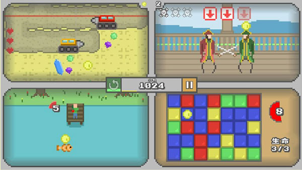 《同屏四玩》带来极具创意的游戏结构设计,打破传统单人玩法局限,巧妙地将四个独立小游戏集成于同一界面中,支持一人挑战多线操作,也可由四位玩家分别控制各自区域进行协作或对抗。游戏内置60余种迷你对战模式,节奏紧凑、反应要求高,充分考验参与者的协调能力与临场判断力。
