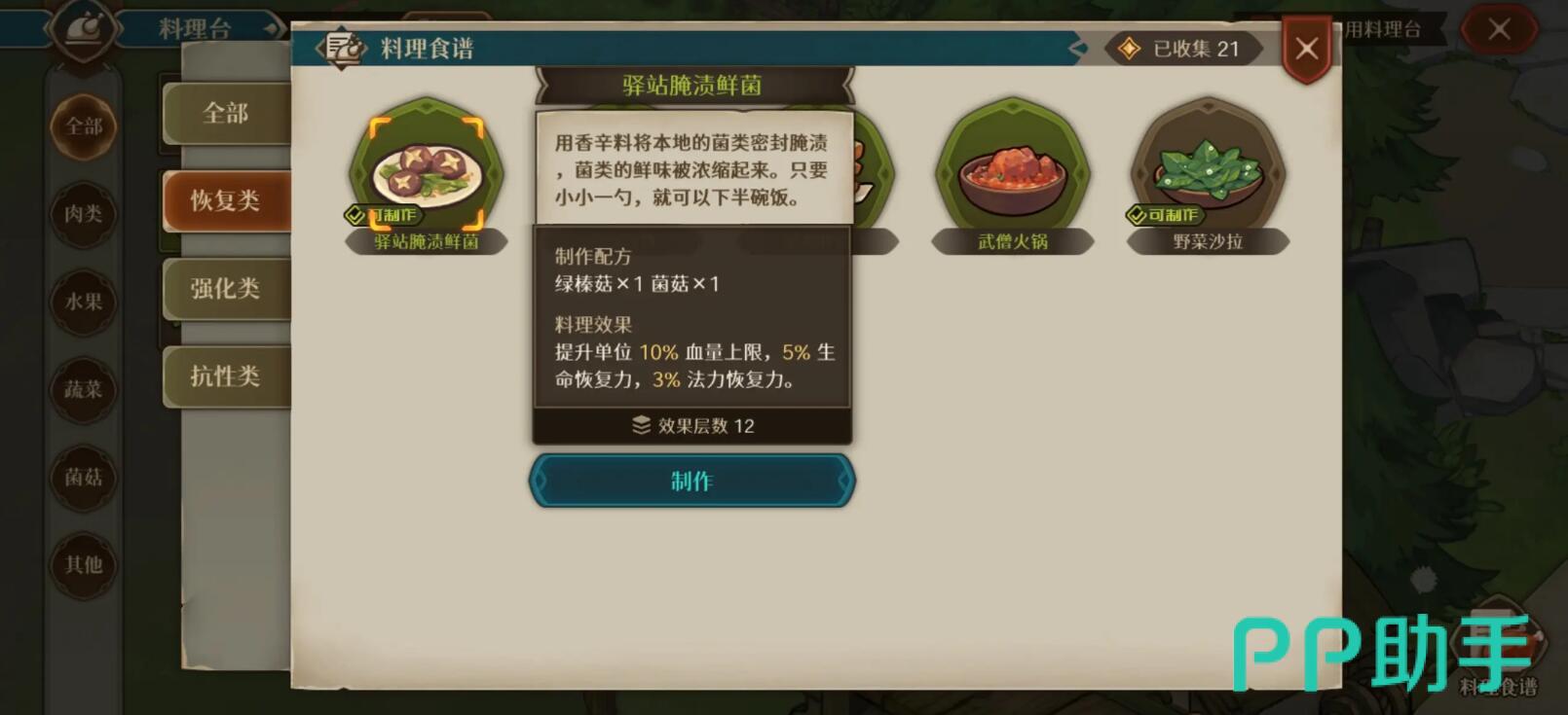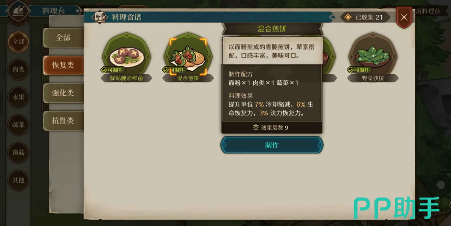 高阶料理需引入三类及以上基础食材。“驿站骨汤火锅”由猪腿骨与肉类构成,同步提升物理攻击、最大生命值及法力恢复速率;“果酱吐司”以面粉与果酱为基础,专注强化物理防御,并显著加快生命与法力双恢复速度;“混合煎饼”则整合面粉、肉类与蔬菜三种原料,核心作用为缩短技能冷却时间,适用于高频操作流派。