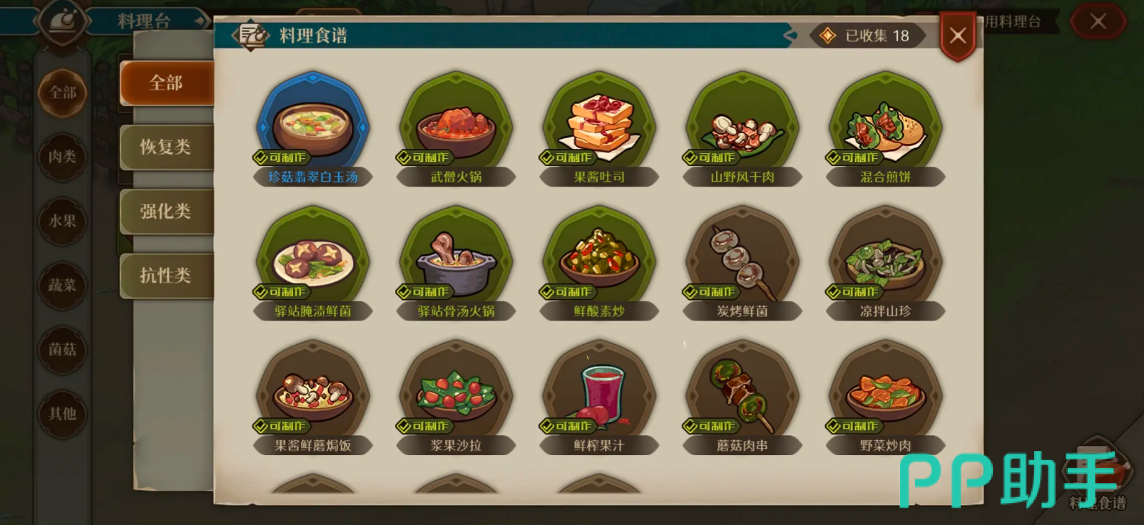 双食材组合是进阶烹饪的基础逻辑:野菜沙拉(双蔬菜)、鲜榨果汁(双水果)、碳烤鲜菌(双菌菇)分别对应生命恢复、法力恢复与抗性提升等差异化增益;而跨类别搭配则带来复合效果——果香烤肉融合水果与肉类,兼顾攻击强化与持续续航能力,体现食材协同的设计深度。