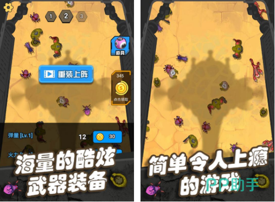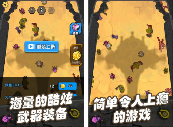 主打快节奏街机式射击体验,采用单手操作优化设计,适配移动设备触控逻辑。玩家操控角色在固定视角场景中灵活移动、跳跃、翻滚,使用手枪、霰弹枪、火焰喷射器等十余种武器清理尸群。关卡含波次挑战、Boss战及限时生存模式,配合粒子特效与音效反馈,营造高强度压迫感与爽快打击感。