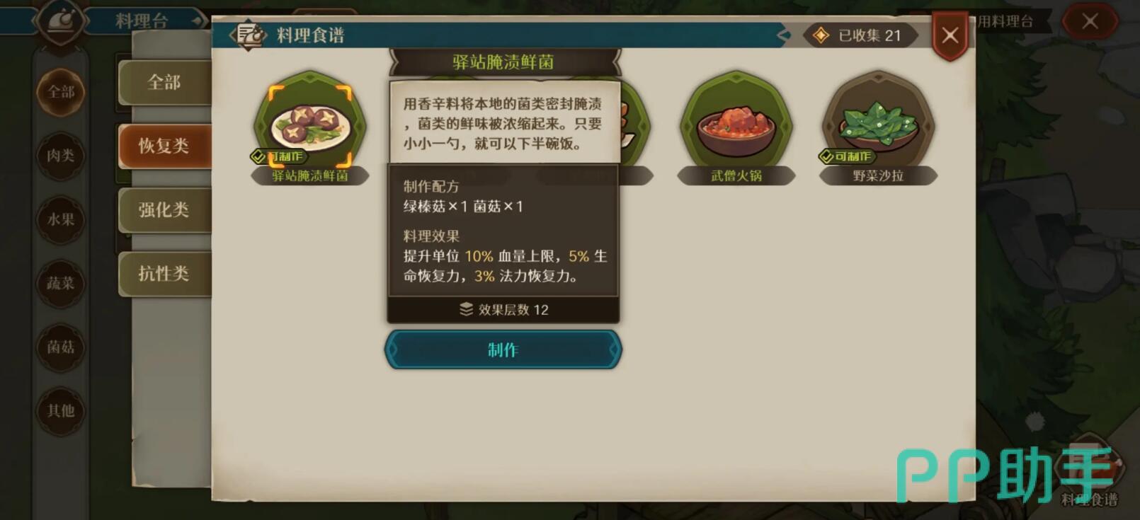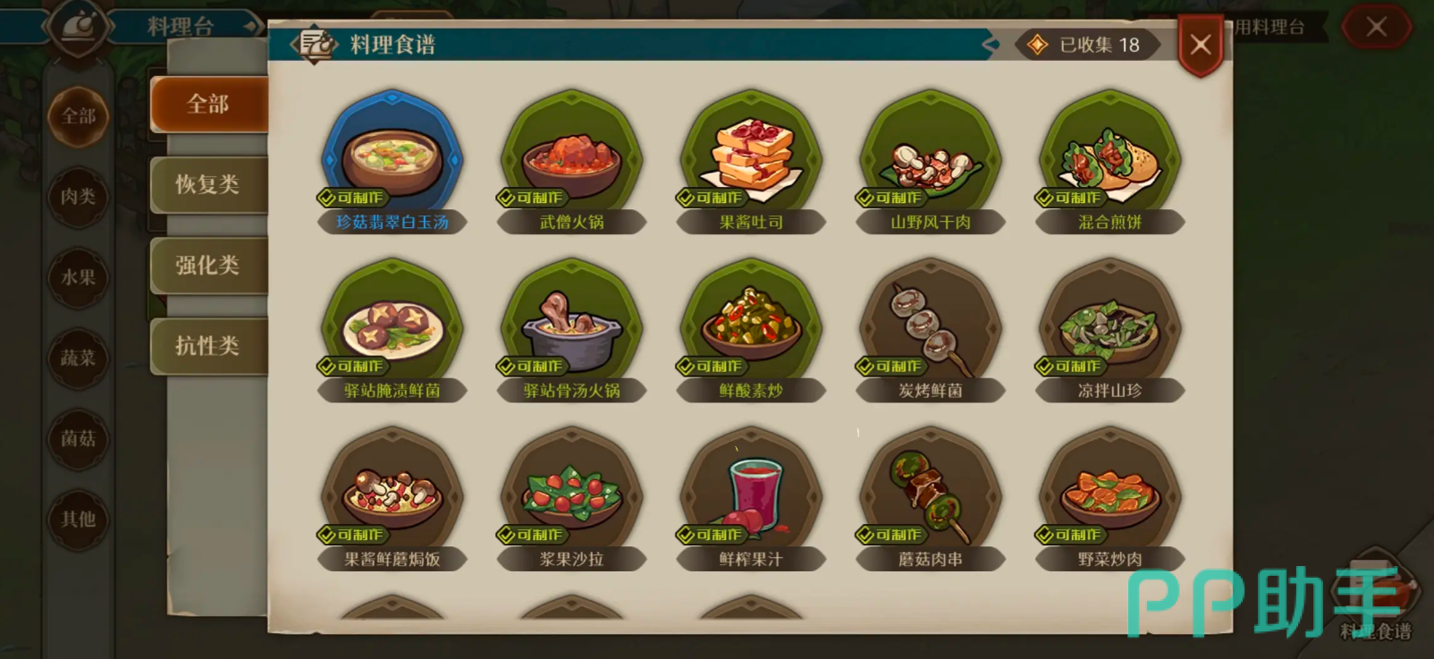游戏中可使用的烹饪材料主要分为几大类别:肉类、蔬菜类、水果类以及菇类,这些构成了料理的基础原料。此外,部分高级配方还会用到调味品等辅助成分。例如,初制的烤肉需要两种不同的肉类并加入调味料进行烹制,食用后可显著增强角色的物理攻击力,适合追求输出能力的玩家选择。