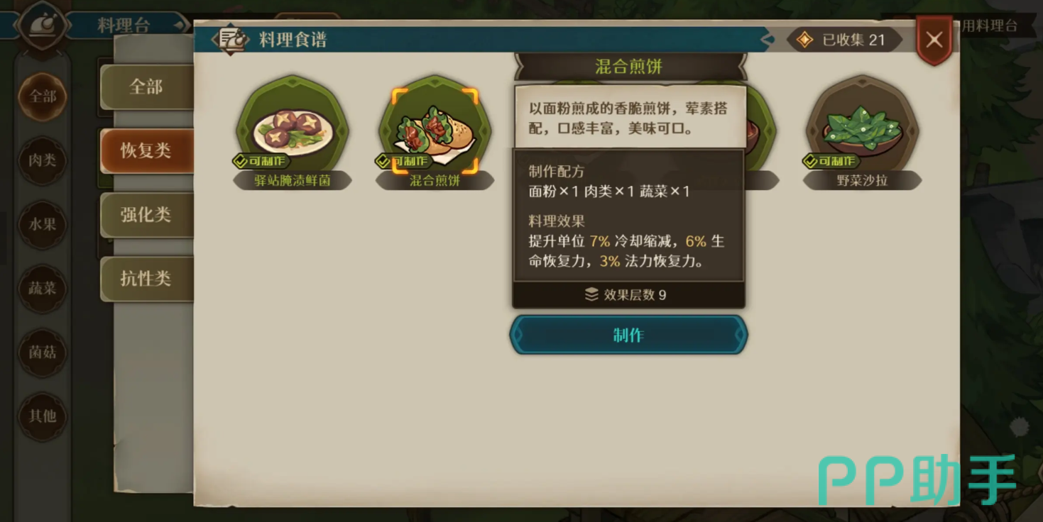 更复杂的料理配方同样值得关注。比如驿站骨汤火锅,其主料包含猪腿骨与任意肉类,成功制作后不仅可以提高物理攻击,还能增加生命上限,并对法力恢复产生积极影响。果酱吐司以面粉和果酱为基础原料,能有效强化物理防御,同时加快生命值与法力值的回复速度,适合长时间作战时携带。至于混合煎饼,则集合了面粉、肉类和蔬菜三种类型食材,最大亮点在于能够缩短技能冷却时间,提升操作连贯性。