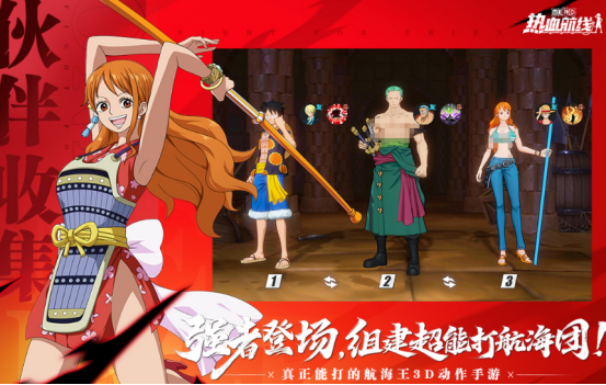 正版授权航海王IP改编的3D即时格斗手游,完整复刻路飞、索隆等原著角色招式逻辑与战斗节奏。支持单人连招、1v1竞技及3v3组队对抗,所有角色内置火、风、水、岩、超人系等属性体系,克制关系直接影响技能释放优先级与伤害倍率,深度影响战术部署与阵容搭配策略。