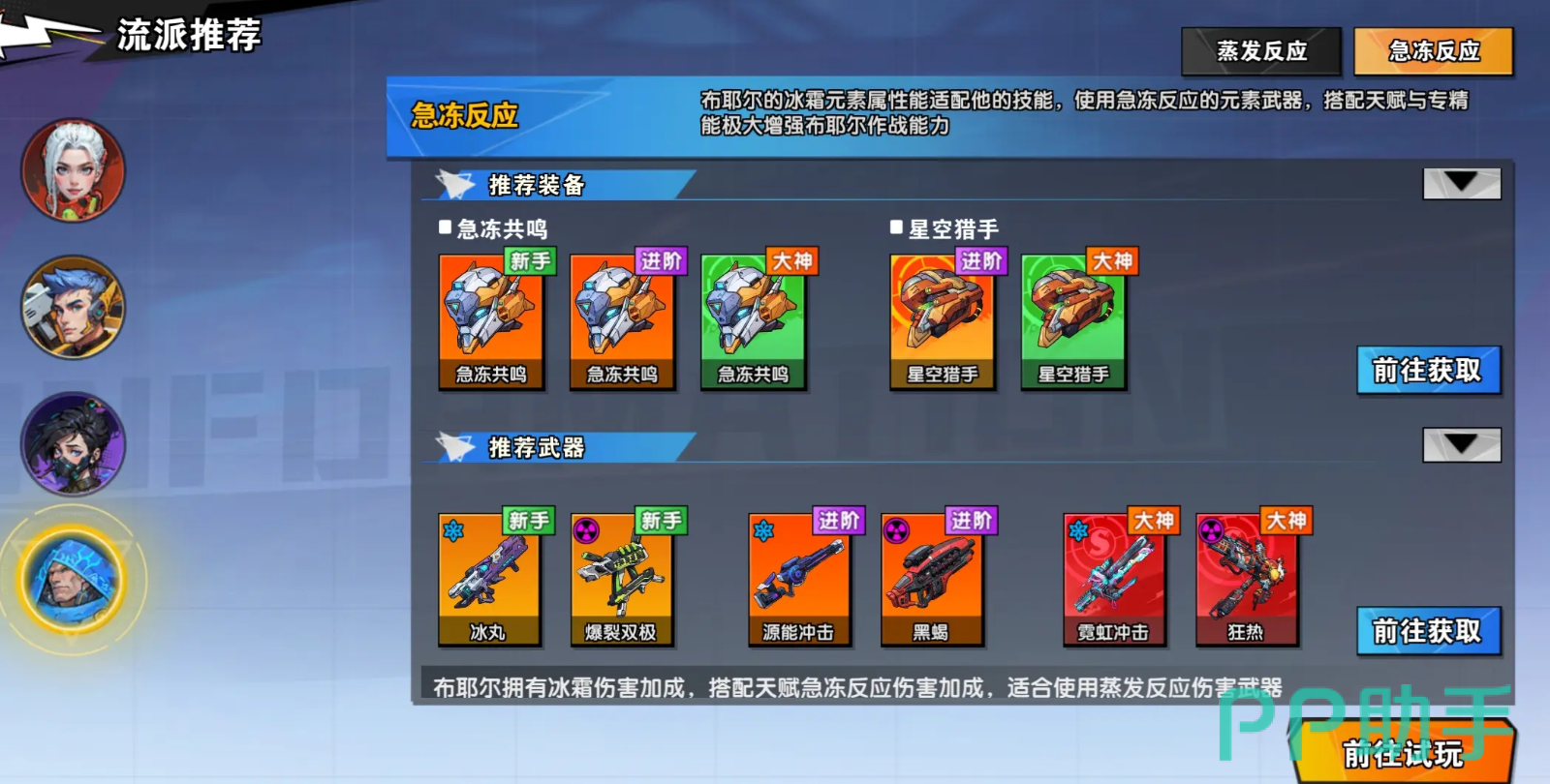 不同角色对应不同的主流流派,新手阶段无需强求特定武器,UR品质武器只要主属性符合当前需求即可使用,后续获得更契合流派的装备再逐步替换。当前版本强势流派包括:妮娅的过载流、布耶尔的急冻流、以及李的放电流,这些体系在实战中均有亮眼表现。