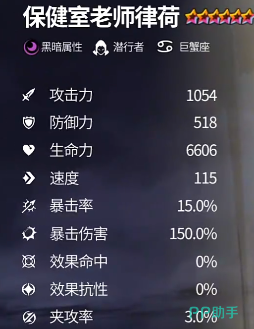 该角色属性为暗,职业归类为潜行者,星座为巨蟹座。基础面板中攻击力处于潜行者职业中上水平,具备一定的输出潜力,同时拥有显著的功能性技能组,整体定位偏向辅助兼节奏控制型半输出角色。