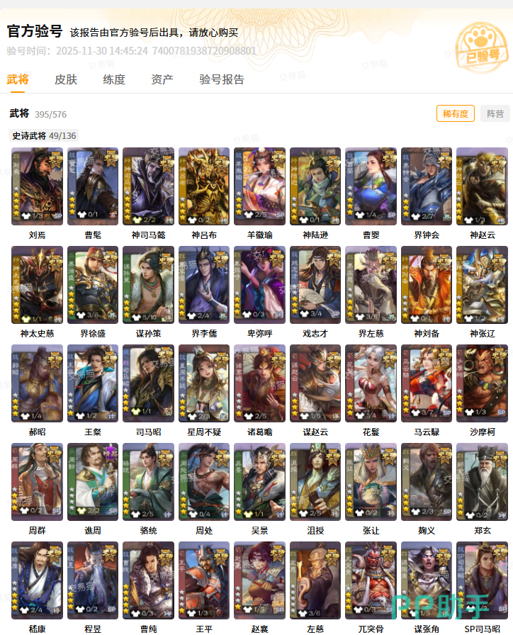 特别针对三国杀这类热门游戏,平台还提供专业的验号服务。工作人员会对上架账号的等级、拥有的武将数量、稀有皮肤持有情况等关键数据进行核实,并将详细信息展示在商品页面,帮助买家全面了解账号真实状态,提升选购效率与准确性。