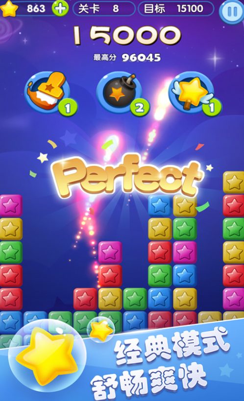 每次点击屏幕消除之后,都会快速触发别致的特效,游戏推送出魔法消除以及炸弹这些特色道具,点击炸弹之后,能够将周围的星星全部炸飞,完成消除,享受紧张又刺激的消除模式。有超级丰富的特色关卡,玩家可选择单机模式,也可与好友联机对战,少有的多人联机消除游戏,将在这里展开热血比拼。