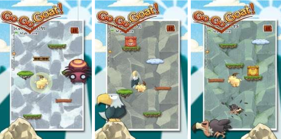 经典重力感应跳跃玩法代表作。玩家通过设备倾斜控制山羊左右位移,在无限上升的垂直空间中持续跳跃攀高。得分与海拔高度正相关,对落点精度要求严苛。场景中随机刷新保护膜、火箭助推器等辅助道具;同时存在老鹰俯冲、仙人掌刺障及不规则浮动平台等复合型阻碍。通关累计积分可兑换限定山羊皮肤及功能性道具。