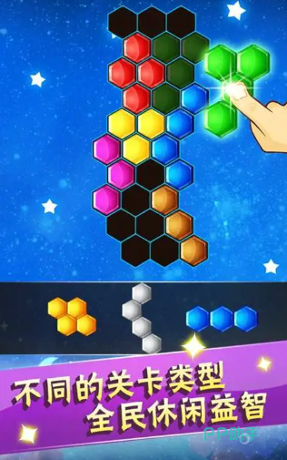 以蜂窝状六边形棋盘为基底,彩色方块自上而下持续下落。玩家通过旋转与定位,将方块嵌入空位,达成横向、纵向或斜向三连及以上同色组合即可消除。连锁消除触发动态光效反馈,连击次数越多,基础分倍率越高,策略性与视觉反馈兼具。