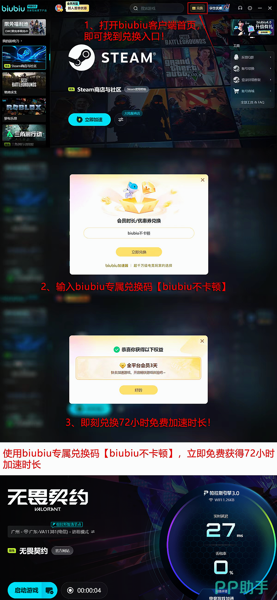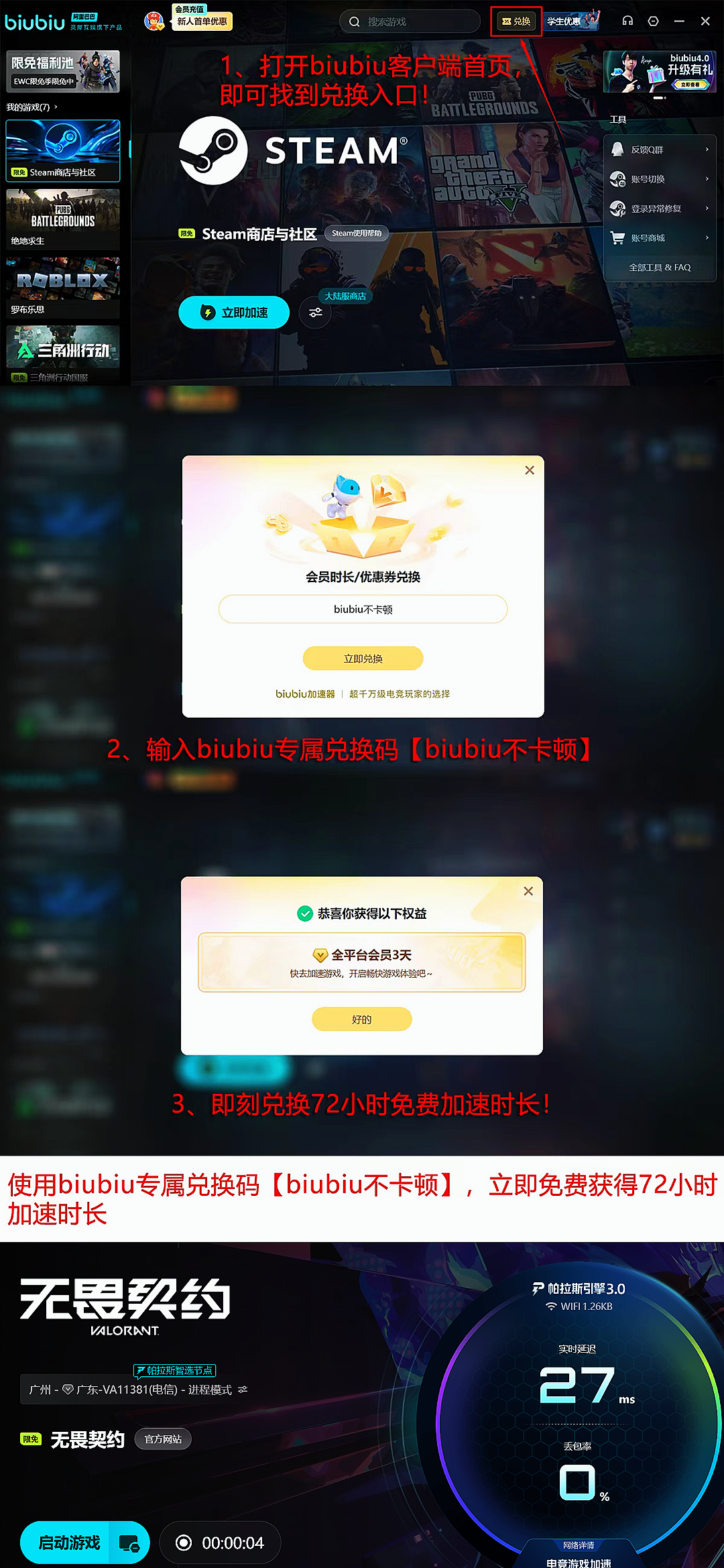 《无畏契约》提供国际服与国服双通道服务,部分用户倾向选择国际服以优先体验新特工、新地图及平衡性调整。但受物理距离与跨境网络结构限制,国际服连接成功率较低、帧率波动明显、匹配耗时延长。biubiu加速器全面覆盖全球主流服务器节点,新注册用户可立即领取24小时全功能试用权限;输入兑换码【biubiu不卡顿】还可额外激活3天高级加速服务,无需订阅即可体验完整优化能力。