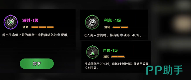 实现稳定硬币产出的关键前置条件是完成全部预言升级。在此基础上,优先激活“溢财”效果——该词条将超出当前生命上限的每1点恢复生命值,按1:1比例转化为硬币。此为整套循环的收益起点。随后叠加“利息”词条,使每次获得硬币时,额外根据当前持有硬币总数按比例增益获取量。最后配置“自愈”能力,并配合树汁瓶使用:当角色生命值低于20%时启用,可使回血效率提升至200%,从而持续触发溢财转化,形成正向循环。