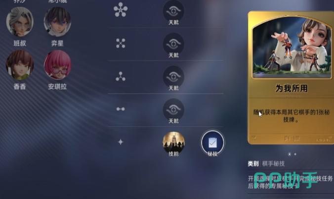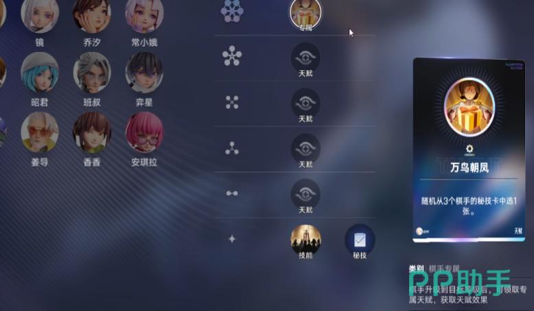 游戏中棋手系统独立于英雄体系之外,共设22位可选角色,涵盖武凤、小妲己、瑶妹、公孙离、姜导、香香、安琪拉、七号等。每位棋手均配备专属技能、天赋树及秘技链路。以武凤为例,其基础被动“门庭赫弈”提供开局+3能量,并在每次拍卖阶段结束后额外获得3点能量;秘技“为我所用”在累计消耗45点能量后触发,可随机获取本局中其他任意棋手的一张秘技;升至6级后激活专属天赋“万鸟朝凤”,允许从三位不同棋手的秘技池中三选一纳入己方构筑。