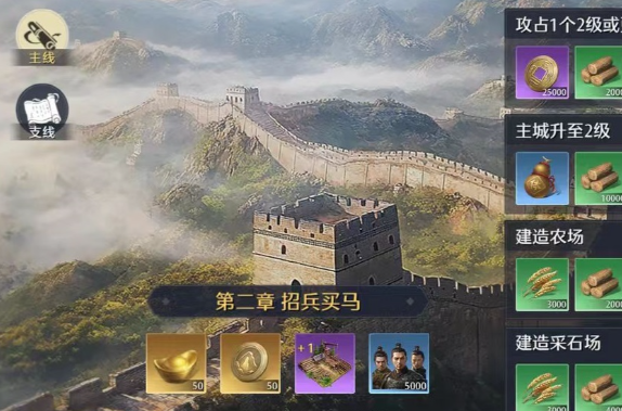 游戏内最主要的玩法就是体验剧情了,一共分为主线和支线两个部分。在主线任务中,剧情是按照章节来分的,而小伙伴们的时间线基本上是跟着三国原著走的。你需要完成系统所颁发给你的各种任务,这样才能够获得每个章节中所包含的最终奖励,并顺利地解锁下一章节。小编建议大家一定要尽力完成主线任务,因为这里面通常会包含一些通过其他方式无法拿到的奖励,而他们通常是你用来升级城市和城市中建筑最关键的部分。