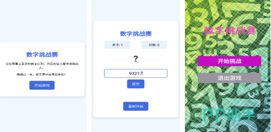 锻炼大家的记忆能力以及观察能力,也适合所有年龄段的人群,在开局之后,屏幕上就会呈现出几个数字,而大家需要在规定的时间之内,记住这些数字,时间倒计时之后就会呈现出空白的格,而大家却需要按照自己记住的数字,按照正确顺序填入进去,如果回答正确就可解锁更高难度的关卡。