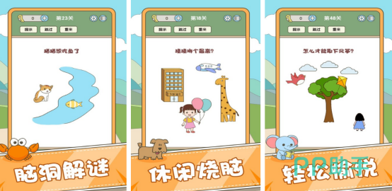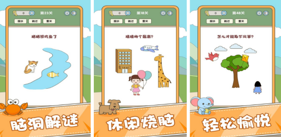 想来一场脑力的锻炼,那么此游戏就是不错的选择,由各种烧脑的谜题组合而成,每个关卡开始之后的题目都是随机的。但在解谜时也需要利用反转的方式成功解答,比如在高高的树上有一个风筝,而下方却站着一个小女孩,想方设法从高高的树上取下风筝。如果遇到难以突破的难题时,也可通过提示或者是跳过的方式挑战更高难度的关卡。