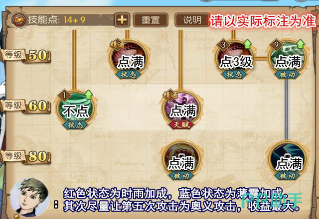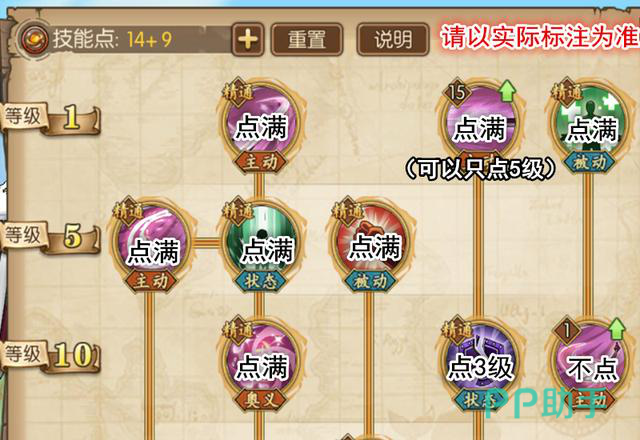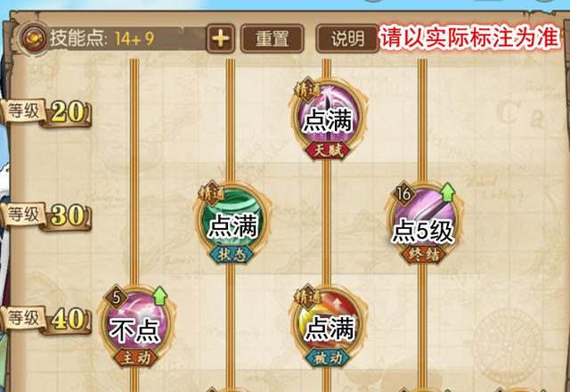 按上述的情况加点,被动、天赋点满,不需要的技能不点,要点前置的就点出现一定程度上级别(状况三级,技能五级)。