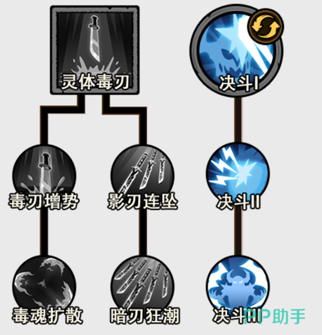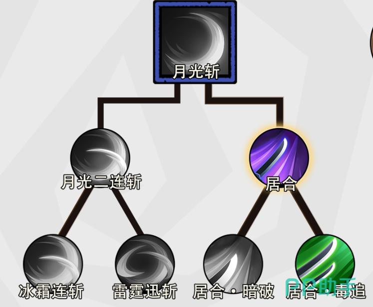 技能树分配是该流派落地执行的关键环节。主输出链路明确:起始点选月光斩,分支依次解锁居合、毒追,构成完整的伤害触发闭环。威能技方面,因太刀类技能基础CD已较短,无需额外压缩,但蓝耗压力明显,故全部投入决斗分支,同步提升居合伤害与法力效率。主宰技则固定选择风行者,保障机动性与技能衔接流畅度。