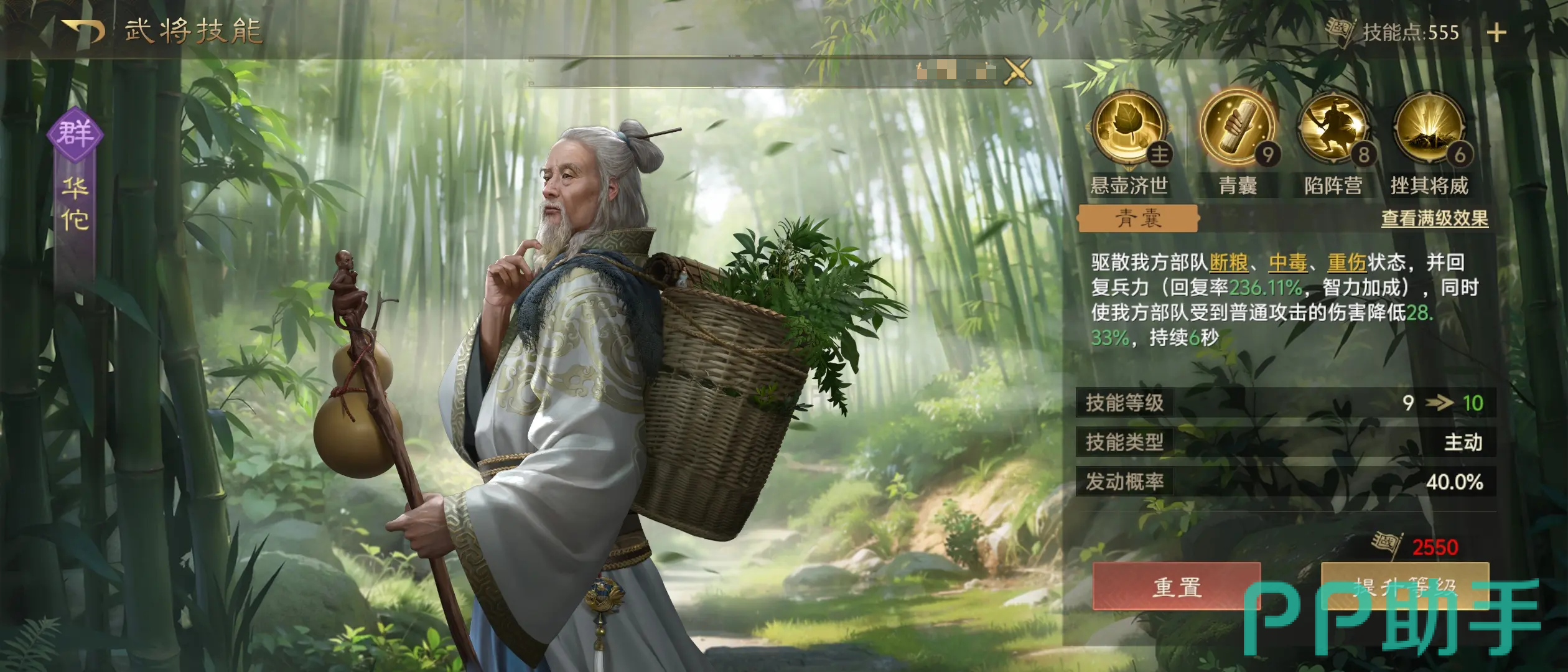徐庶承担辅助输出与团队续航双重职责。虽然其自带中毒概率低于部分专精毒系武将,但配合“侵蚀”类战法后,整体挂毒稳定性显著提升;更重要的是,他具备稳定的群体治疗能力,可在战斗中持续补充前排血线,延长全队站场时间,为司马懿创造更多触发反噬与“借尸还魂”的机会。