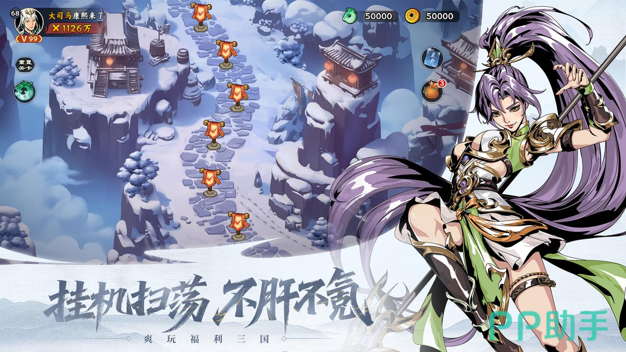 游戏内置智能挂机体系,支持一键开启资源扫荡,离线期间仍可持续获取经验、金币、装备材料等关键养成资源。整体养成曲线平滑,无强制肝度设计,零氪或轻度投入玩家亦可通过合理规划,完整培养主力武将阵容。