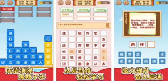 主打系统化闯关体验,初期侧重高频成语入门,后期逐步嵌入典籍出处、历史典故及文言用法等深度内容,对玩家词汇储备与文化积累提出进阶要求。整体美术采用水墨国风,搭配古韵音效与动态笔触动画,营造沉浸式传统文化语境。通关晋升机制联动奖励系统,助力持续挑战动力。