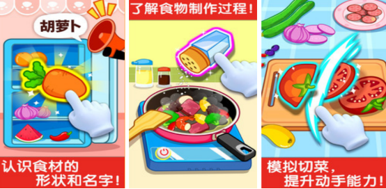 宝宝化身成为厨师,在厨房当中完成切菜、炒菜等一系列特色操作,采用q版角色和艳丽的特色场景,种种设定都比较符合儿童的,在游戏当中,包括中餐、甜品站等不同的主题场景,所有小朋友都能详细了解具体的厨房活动,并认知超过15种不同的常见食材,不同的难度等级,再加上成就激励,当完成菜品制作之后,即可收集星星贴纸。