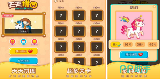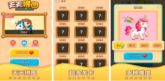 主打视觉丰富性与玩法梯度,内置风景摄影、二次元插画、萌宠特写等高清图源,满足多元审美需求。基础模式还原经典拼图逻辑,计时挑战模式则强化反应速度与手眼协调能力,难度曲线平滑递进,覆盖3岁至成人全年龄段用户。