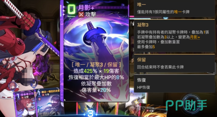 千鹤的四大机制彼此咬合,其中“束缚”与“鬼火”构成运转中枢。处于束缚状态时,角色虽无法进行回合外行动,但可显著提升“月影”与“月影+”的触发频次,从而强化整体伤害密度。鬼火则是切换至月影形态的唯一媒介——需累计足量鬼火方可完成形态转换;而手中持有的月影数量达到阈值后将自动合成,每次合成叠加1层效果,当层数累积至特定数值(如三层)时,即转化为强化形态“月影+”。最终合成层数直接决定月影+的基础倍率上限。值得注意的是:仅普通攻击段数可生成鬼火,月影及月影+的攻击段不参与鬼火积累。