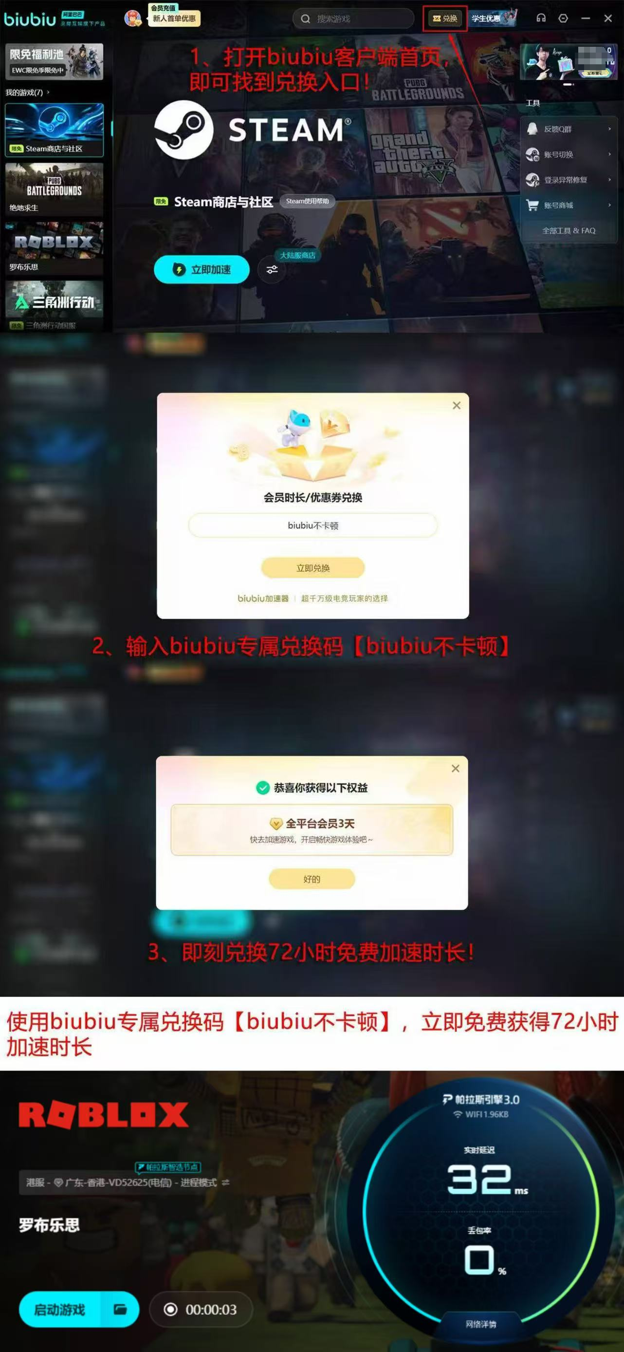 在服务设计层面,biubiu加速器采用“先试后付”策略:新用户完成基础注册后,无需绑定支付方式或完成任何任务,即可立即领取24小时全功能免费加速权限,覆盖Roblox主流玩法测试周期。若需延长体验,输入专属兑换码【biubiu不卡顿】,可额外激活72小时连续加速服务,总计达96小时无限制使用。该机制无隐藏条件、无自动续订、无强制分享要求,旨在让用户基于真实体验自主决策。