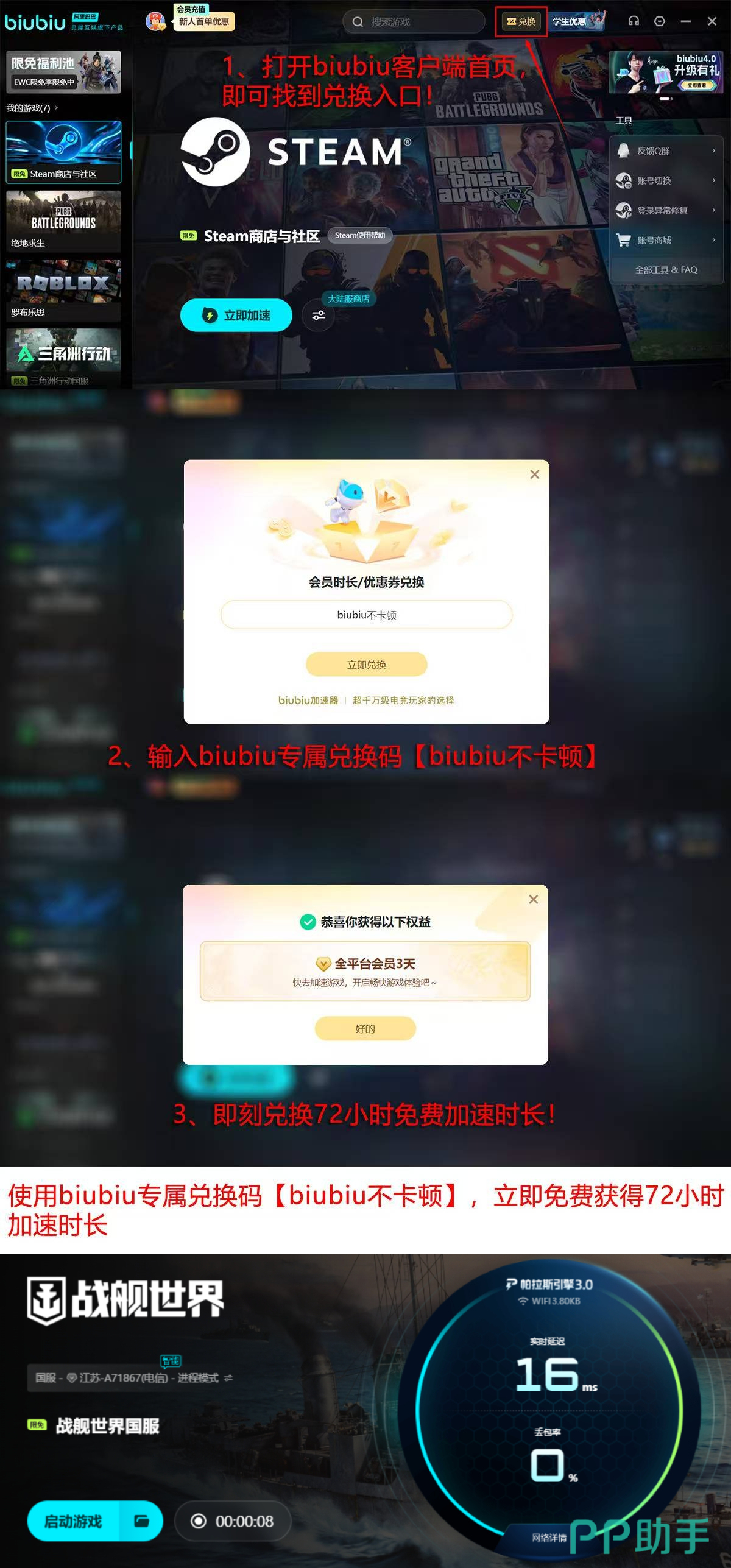 本次升级显著提升网络协议处理效率。为降低新手接入门槛,新注册用户可立即获得24小时全功能加速服务;输入激活口令【biubiu不卡顿】,还可额外延长72小时使用权限,总计享有96小时稳定低延迟作战体验。