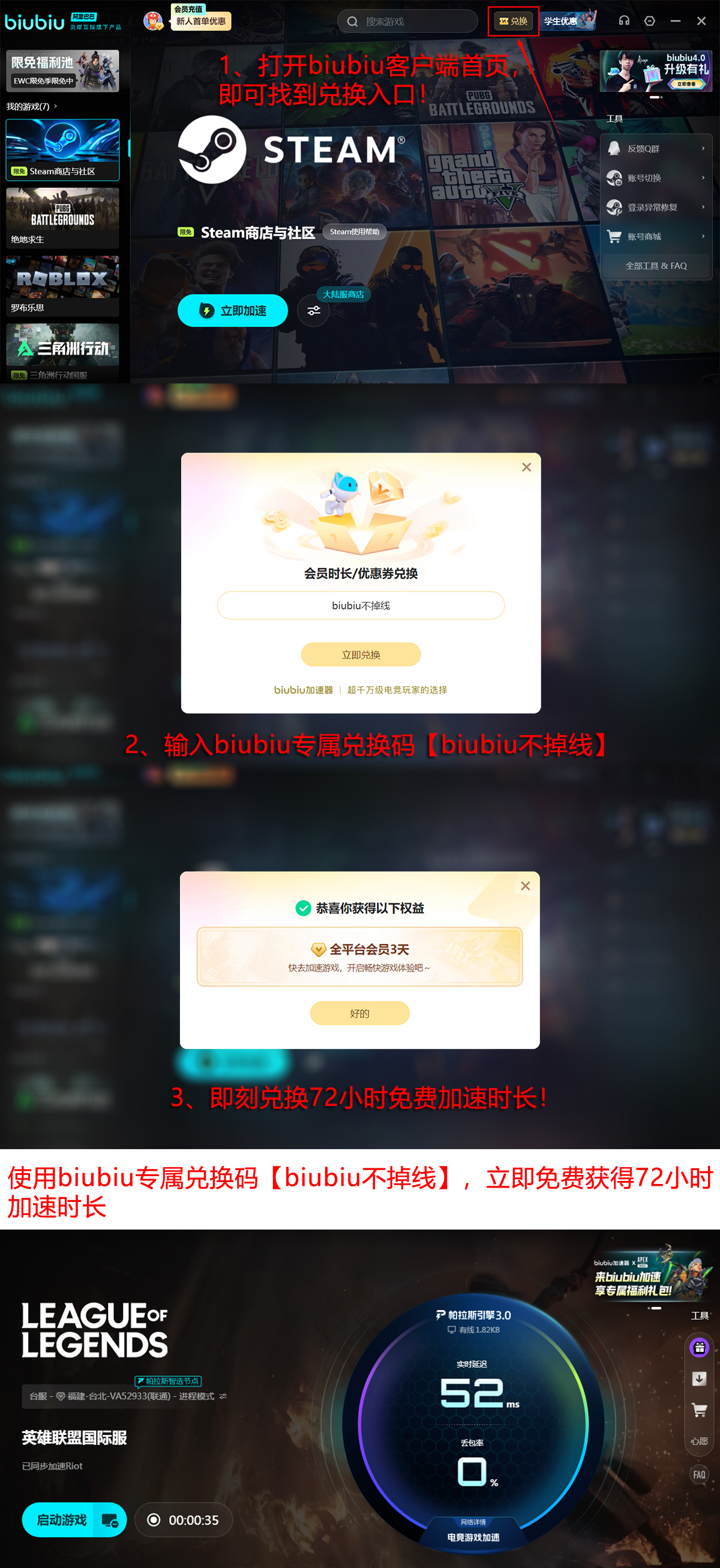 新用户注册后可享24小时全功能免费试用;完成指定任务后,再领取【biubiu不掉线】权益,即可额外获得72小时服务时长。两项叠加,新人累计可用免费服务总时长达96小时。