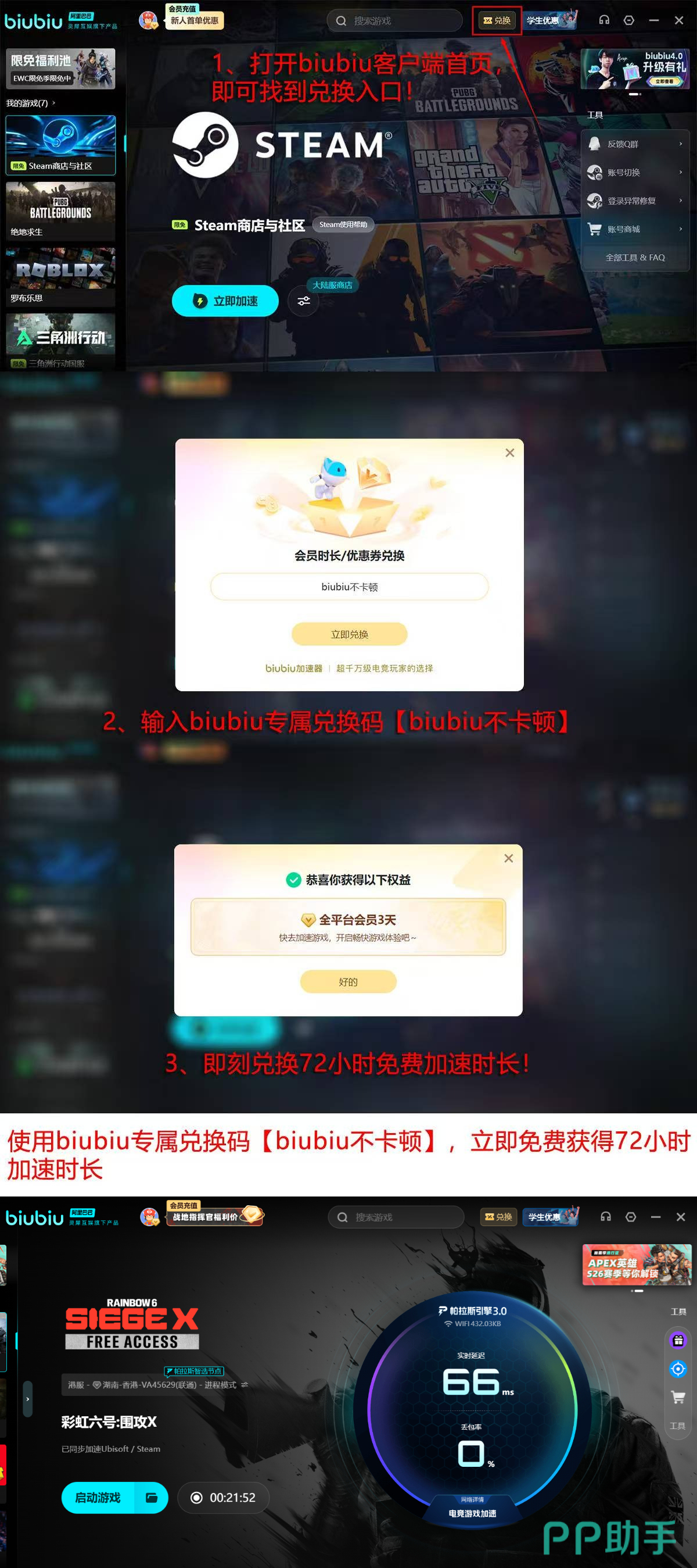 为降低体验门槛,biubiu同步启动限时体验计划:新用户注册即享24小时无限制加速服务;输入专属口令【biubiu不卡顿】,还可额外领取72小时全节点护航加速权益,总计可累计使用96小时高质量网络加速服务。