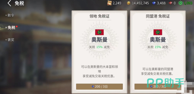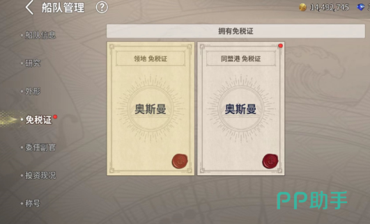 游戏中免税证分为两类,功能定位清晰,覆盖不同贸易场景:其一是“领地免税证”,生效范围涵盖目标国家主城及其下属全部领地港口,适用于高频往返于同一国家境内多个港口的区域型贸易者;其二是“同盟港免税证”,仅作用于该国已缔结同盟关系的指定港口,专为以跨国同盟航线为主干的远洋商队设计。需特别注意,两类证件均设有固定有效期,到期后自动失效,玩家须在时效截止前完成续办,否则关税减免将中断。