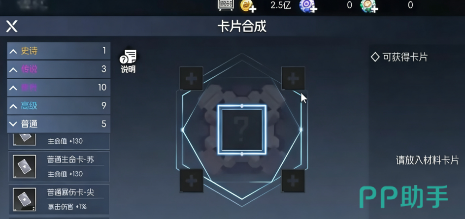 在启动合成流程前,建议优先筛选具备“暴击”效果的卡片——无论其基础品质为白色、蓝色或紫色,只要携带该核心属性,均应保留待用。切忌无差别合并,而应将属性单一、泛用性低或当前阵容无需的同色卡作为合成原料,从而避免资源浪费,同时稳步提升卡片整体品质。